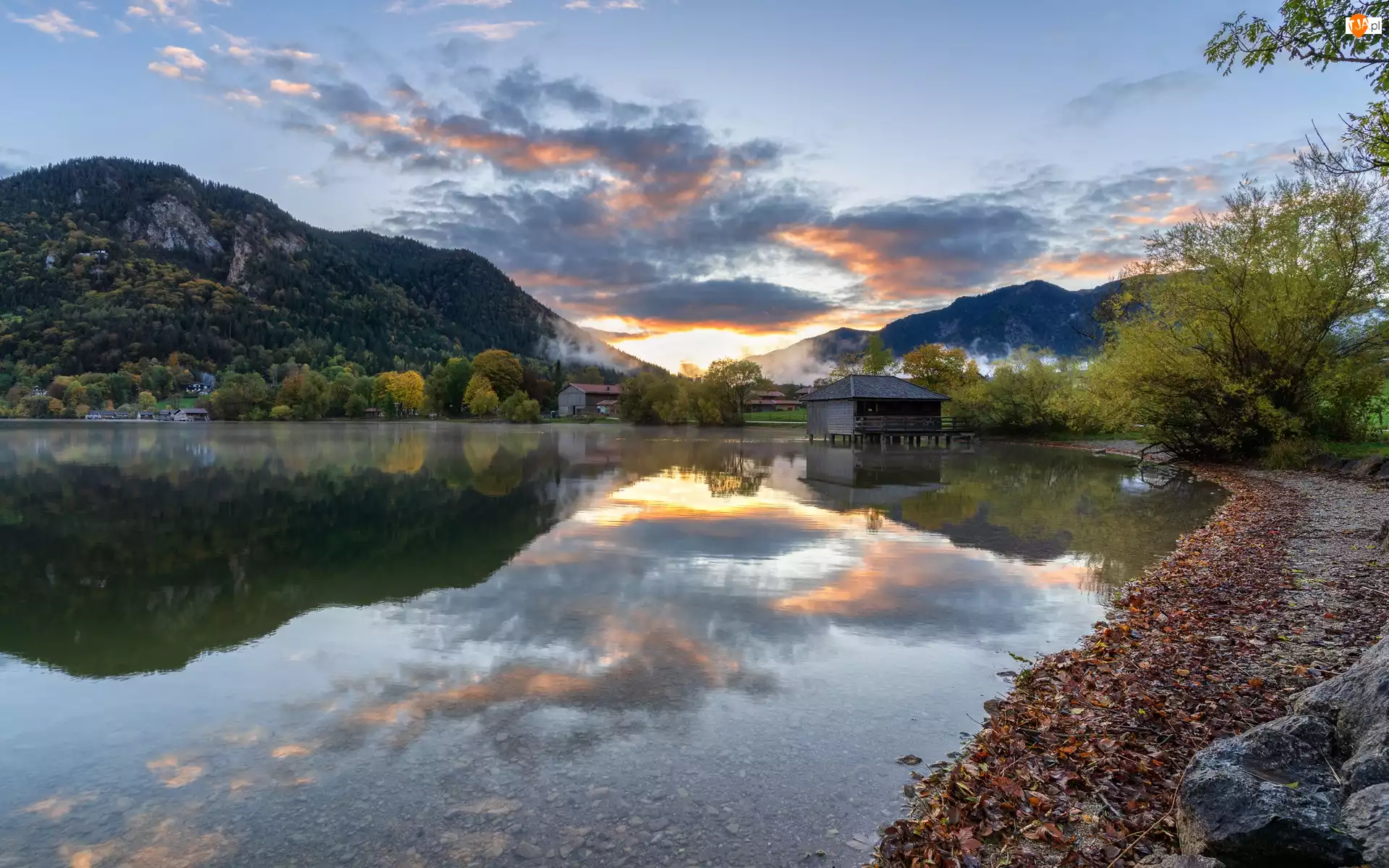 Drzewa, Chmury, Jezioro, Góry, Domy