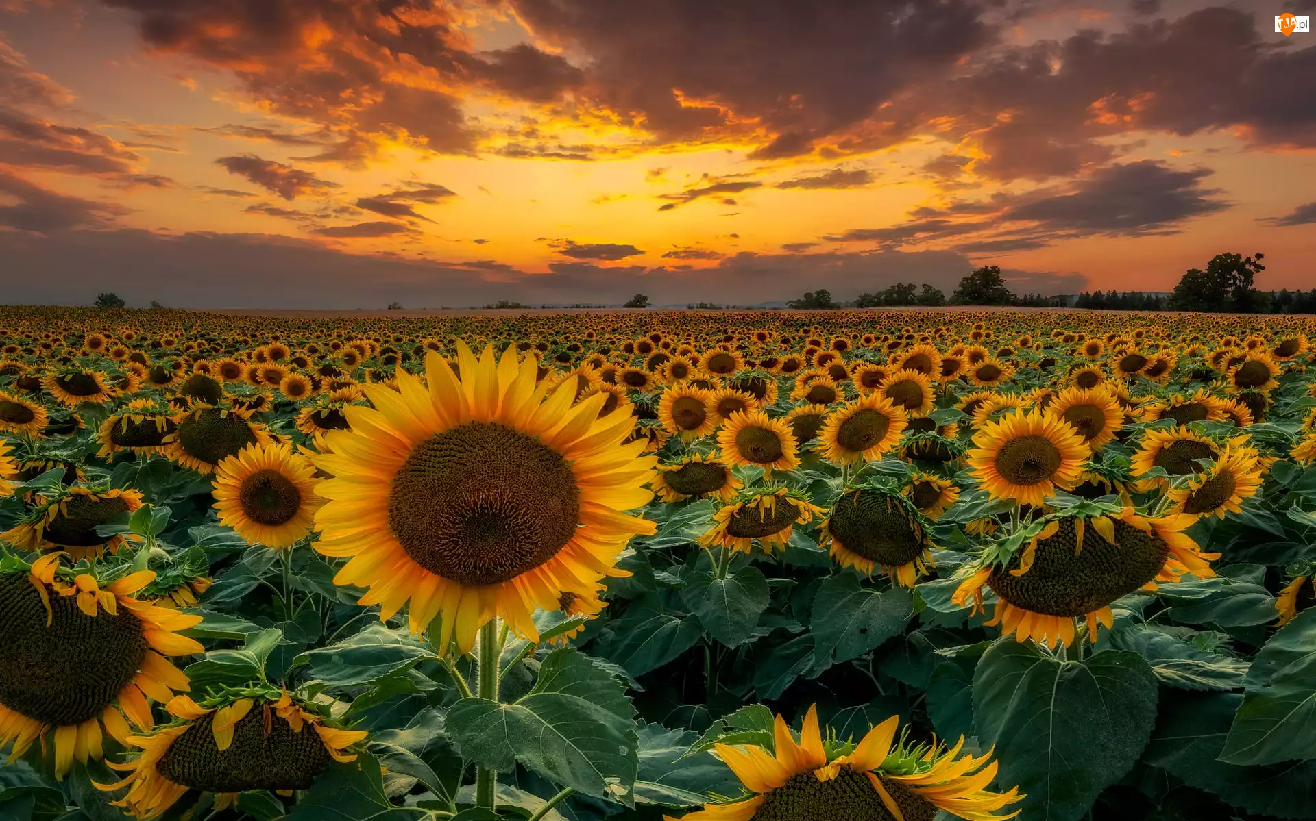 Drzewa, Chmury, Słoneczniki, Pole, Zachód słońca