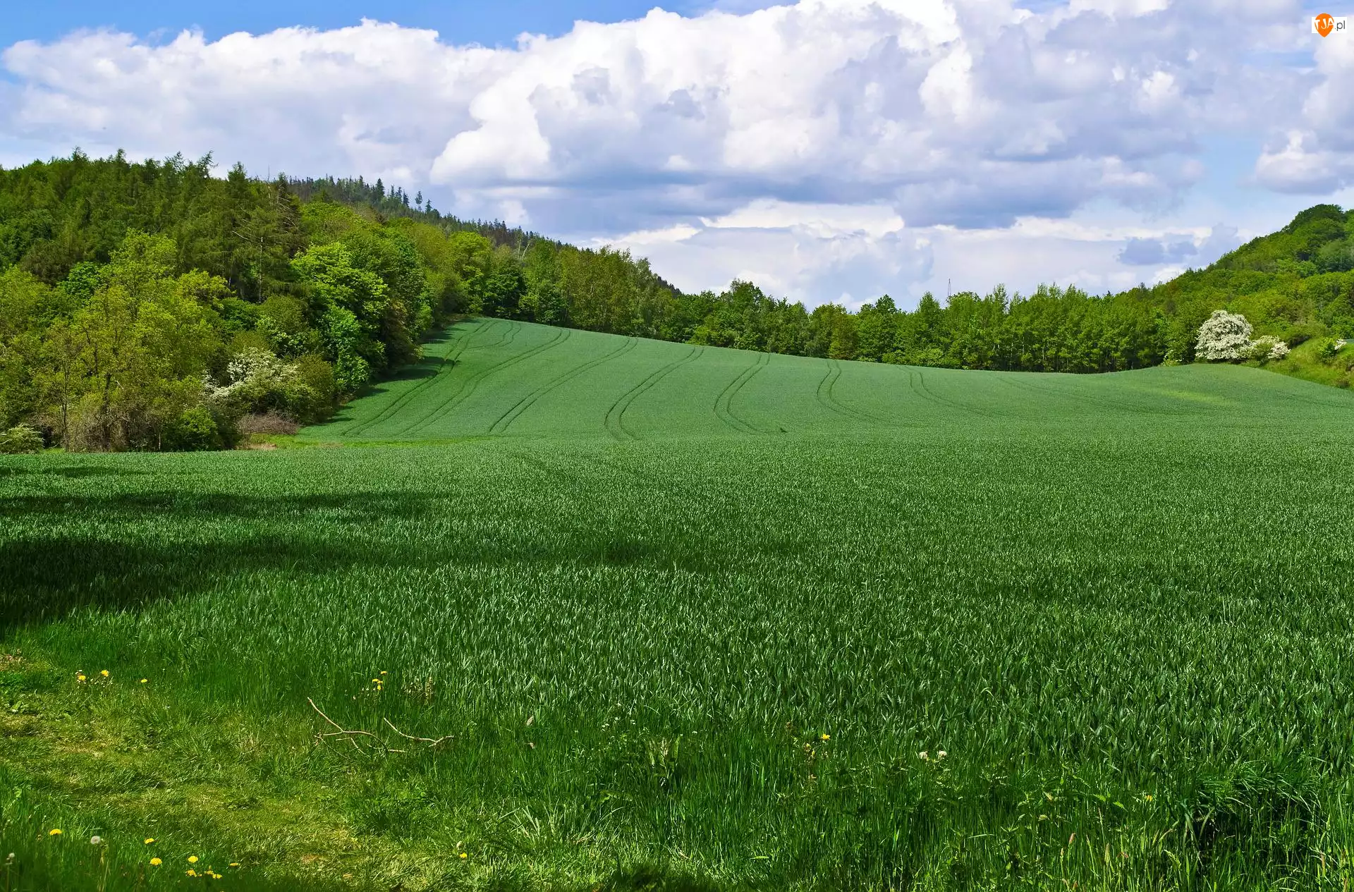 Drzewa, Chmury, Wzgórza, Pole, Las