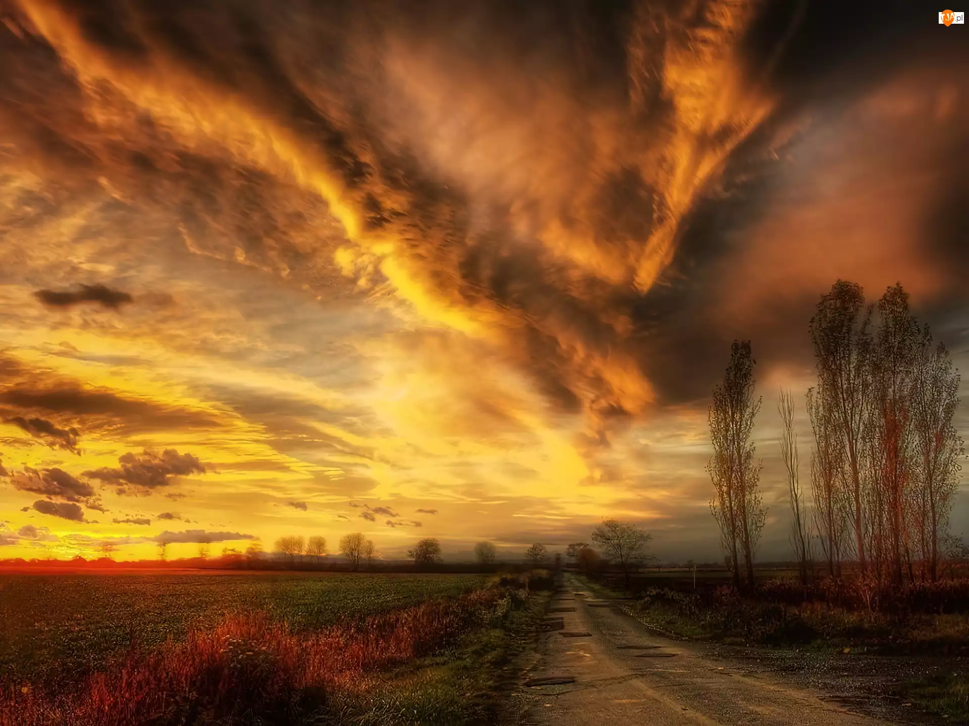Drzewa, Chmury, Zachód, Droga, Słońca