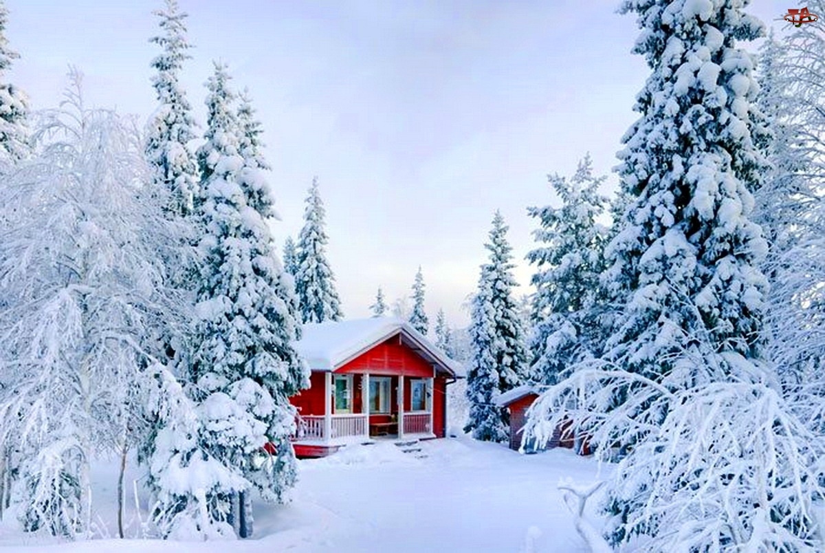 Drzewa, Czerwony, Zima, Domek, Ośnieżone