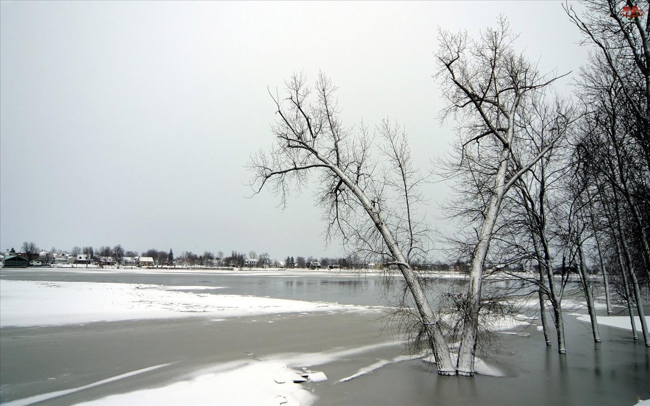 Drzewa, Dali, Zamarznięte, Domy, Jezioro, W