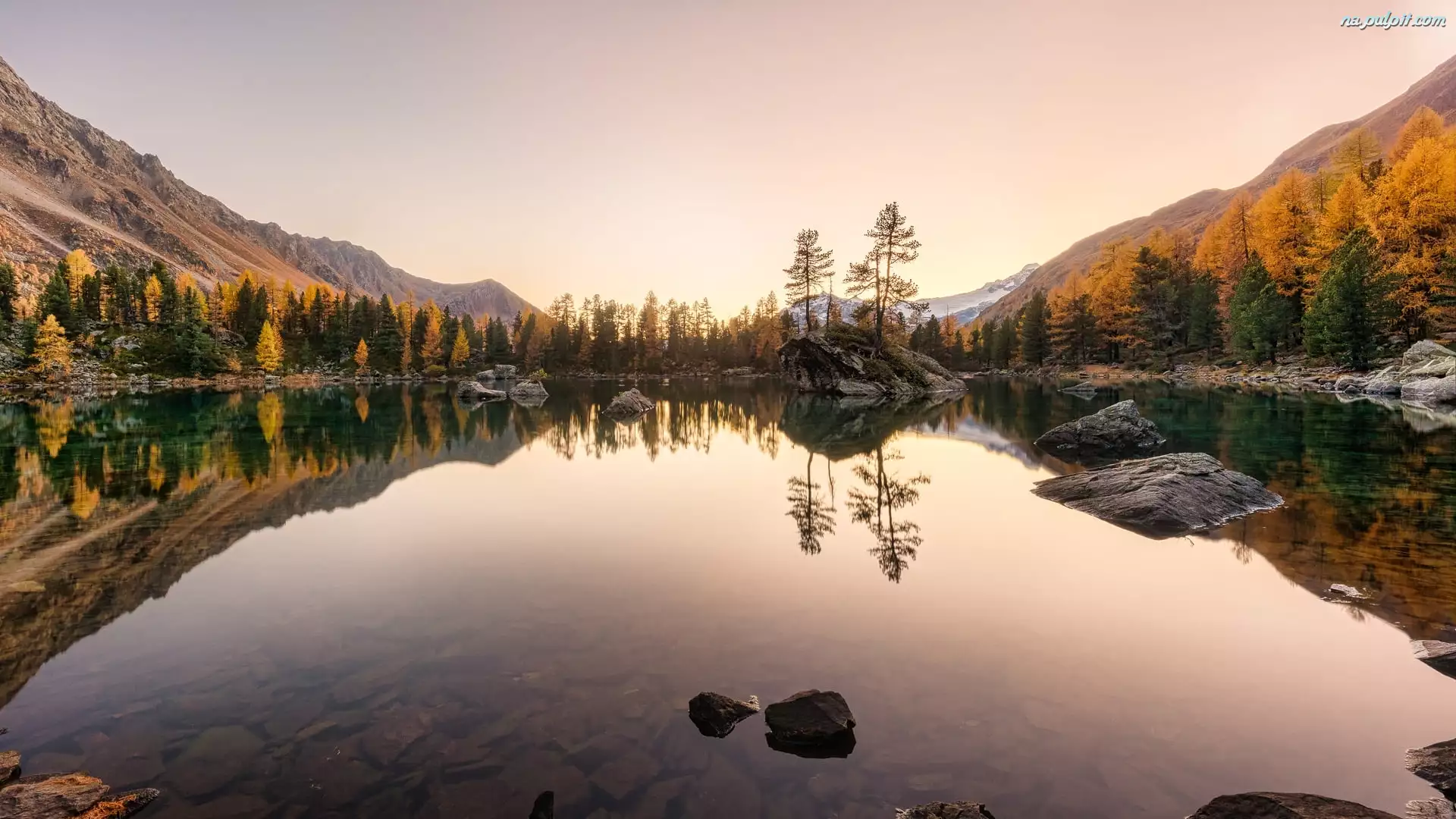 Odbicie, Kamienie, Drzewa, Lago di Saoseo, Kanton Gryzonia, Szwajcaria, Alpy, Góry, Jezioro, Jesień