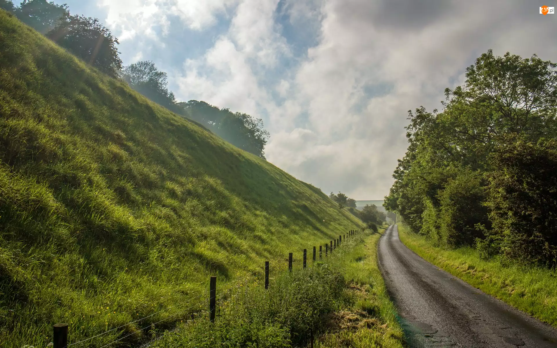 Drzewa, Droga, Trawa, Ogrodzenie, Wzgórze, Chmury