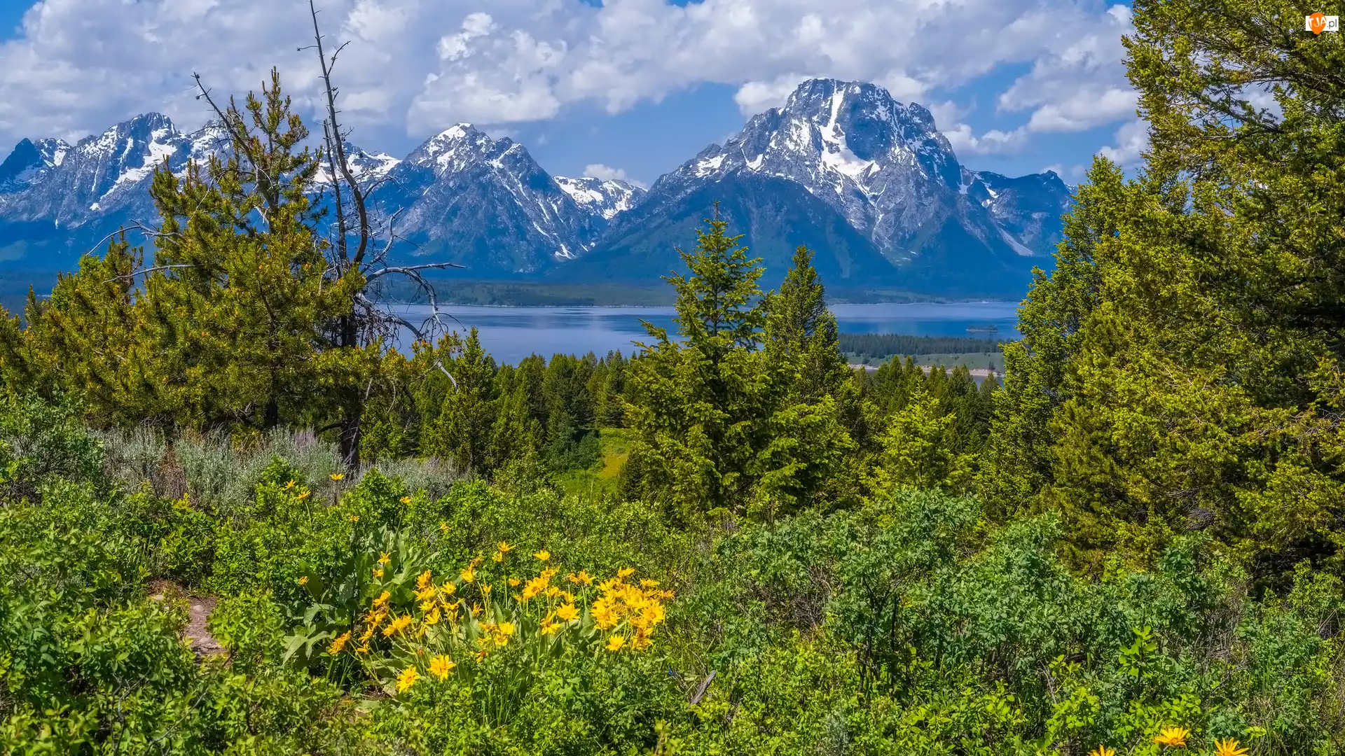 Drzewa, Góry, Park Narodowy Grand Teton, Stany Zjednoczone, Kwiaty, Wyoming