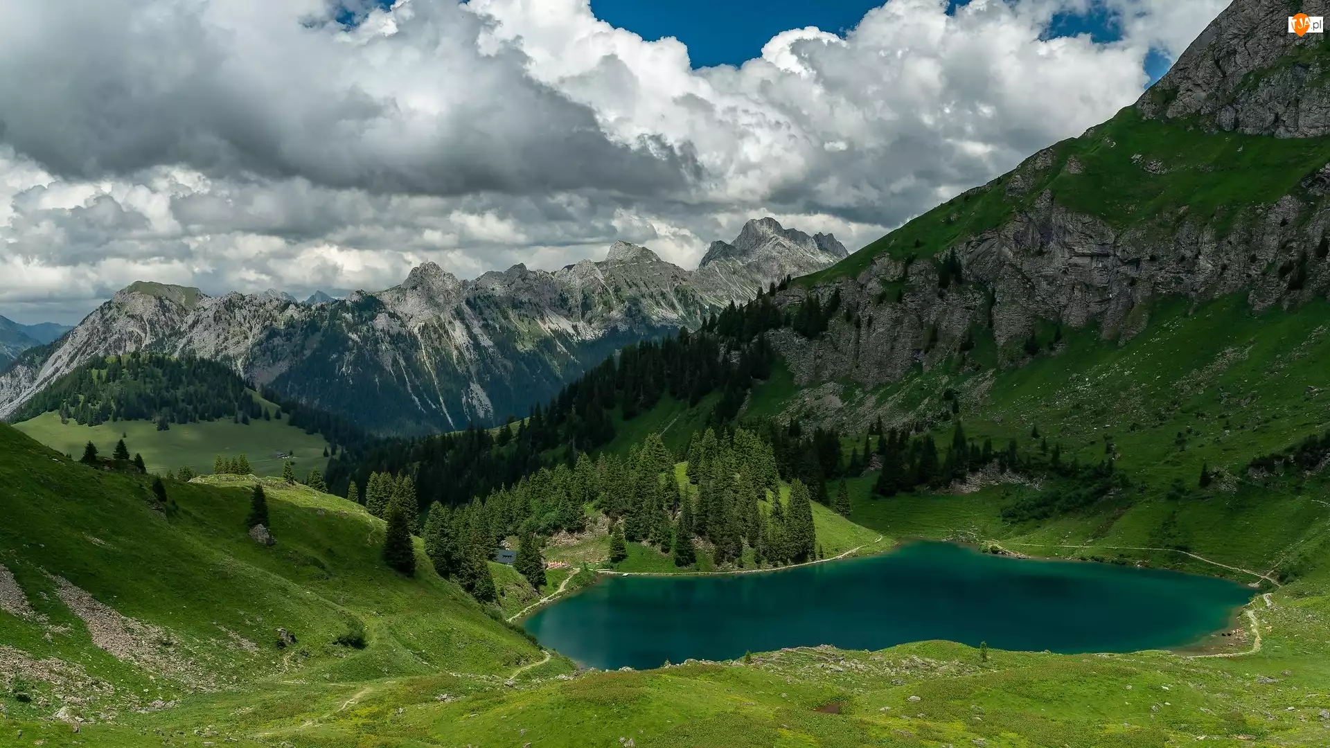 Drzewa, Góry, Jezioro, Kanton Vaud, Alpy Berneńskie, Lac Lioson, Szwajcaria, Chmury