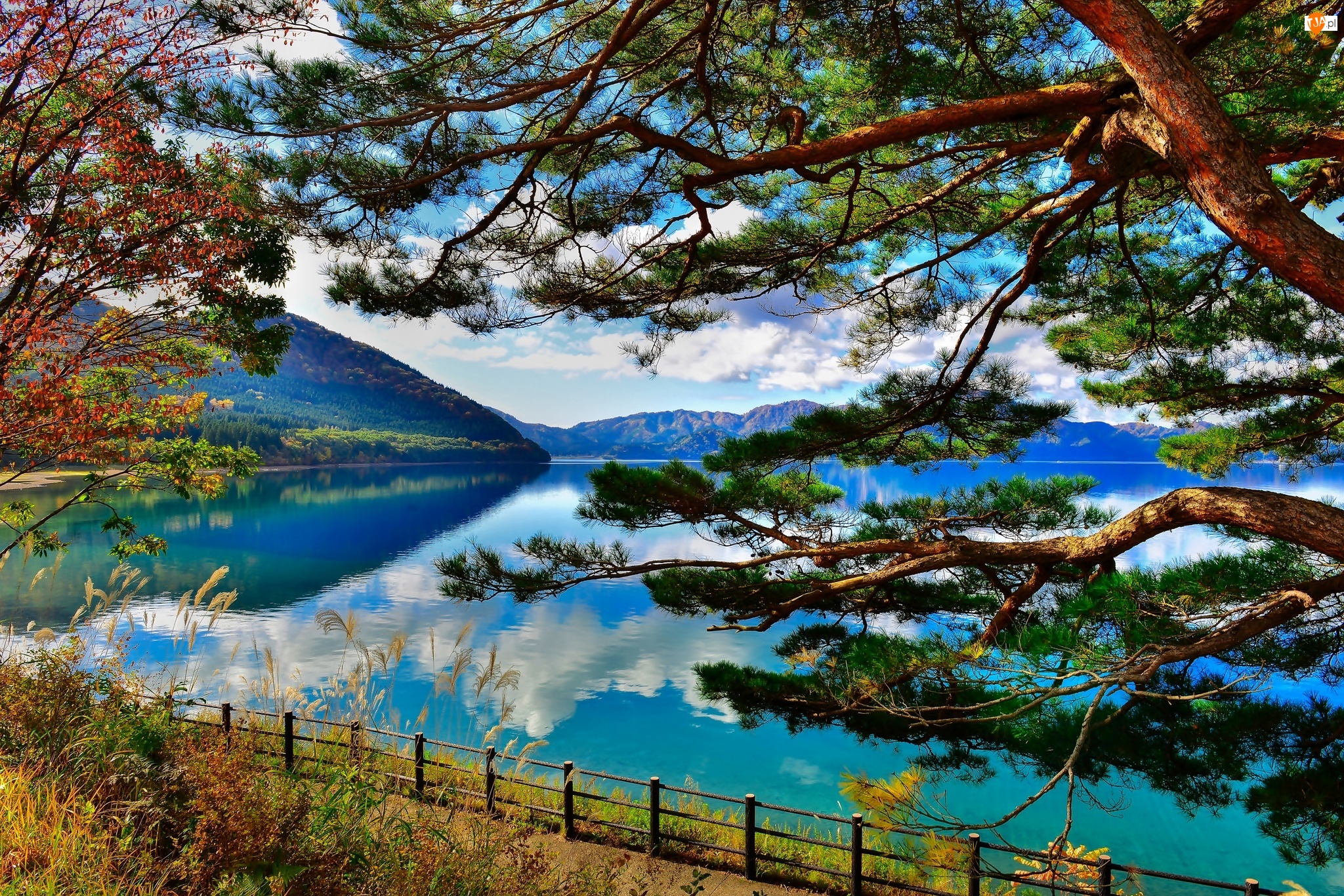 Jezioro, Góry, Drzewa, Japonia, Tazawa Lake, Akita