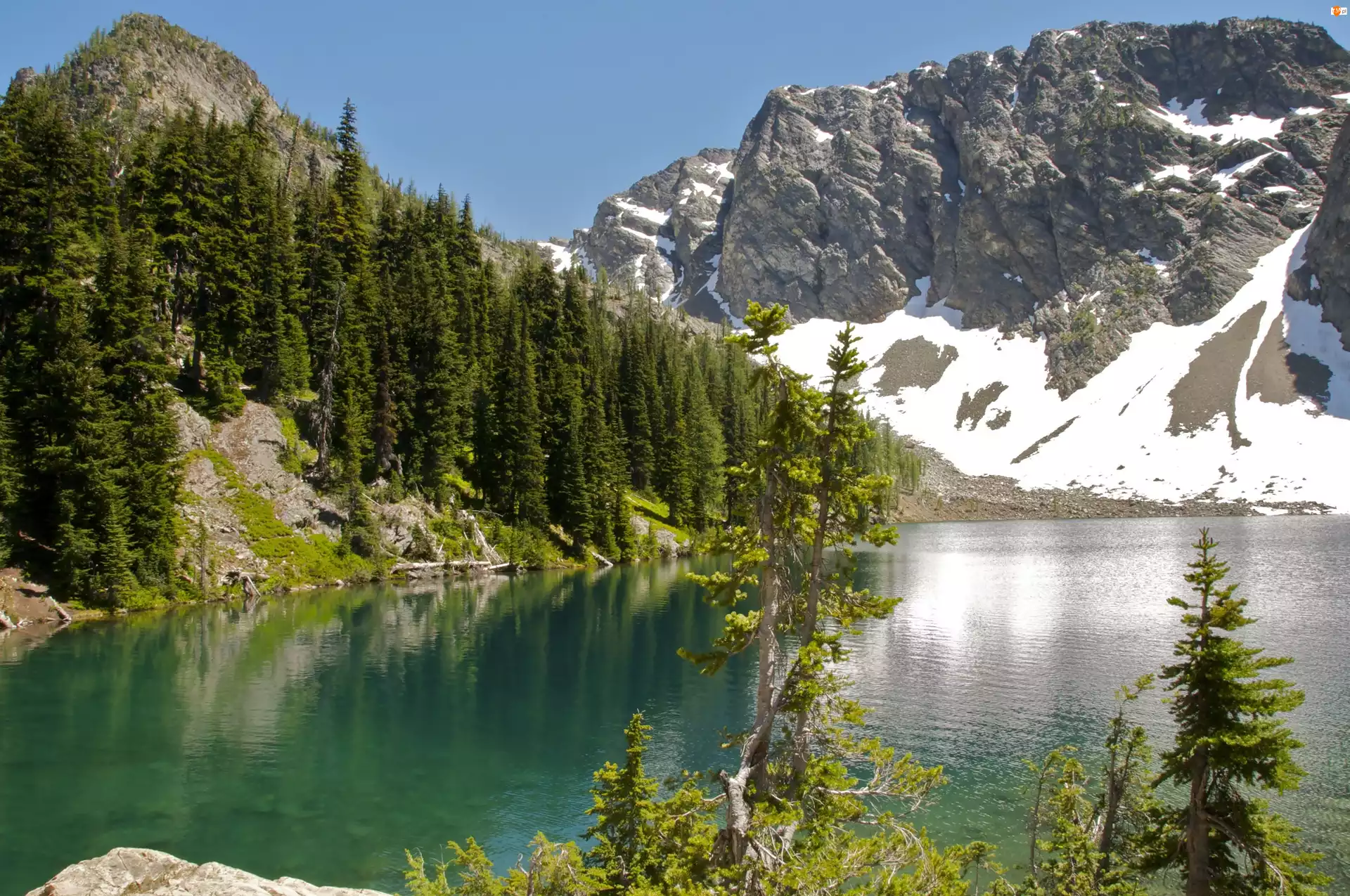Drzewa, Góry, Jezioro, Śnieg
