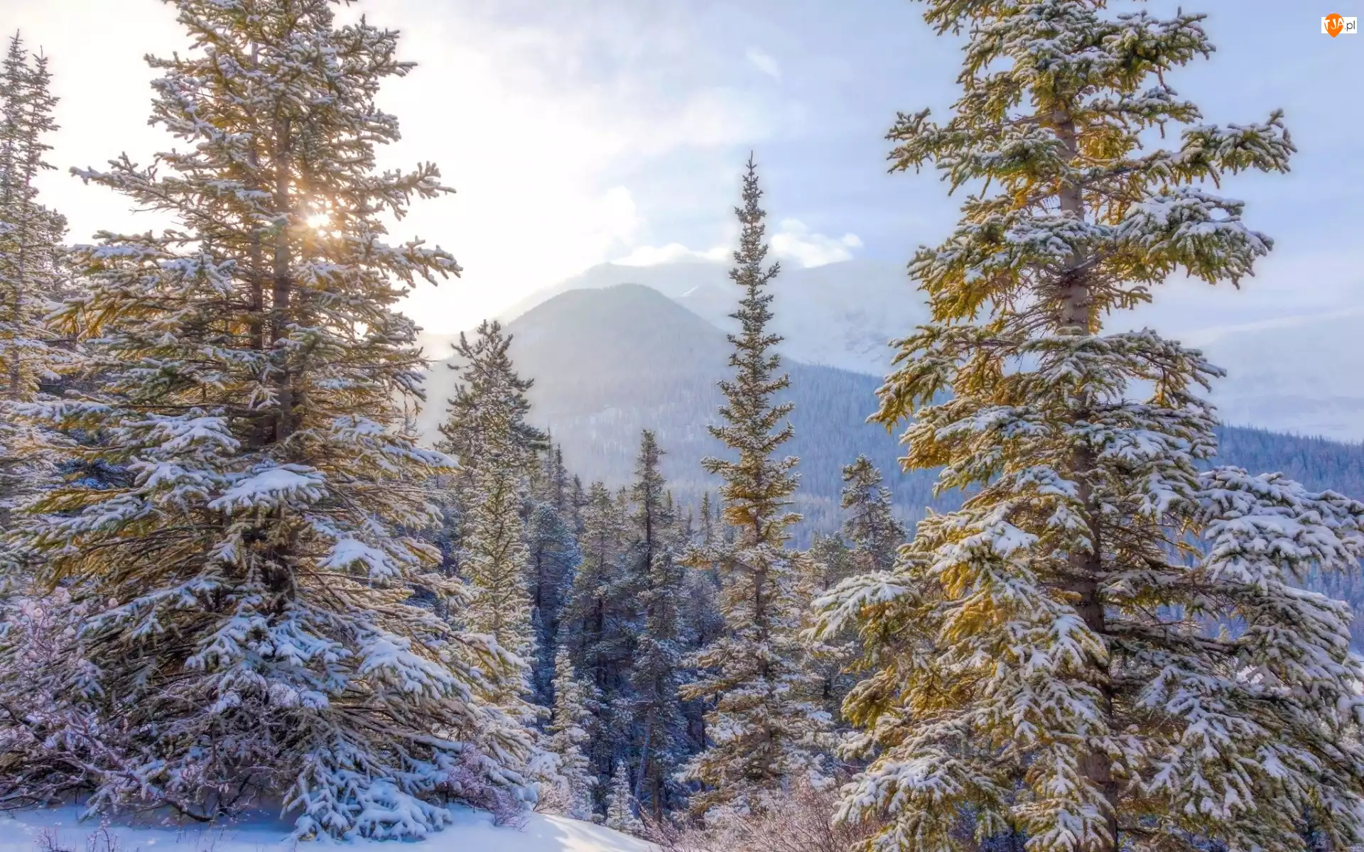 Drzewa, Góry, Śnieg, Zima, Świerki
