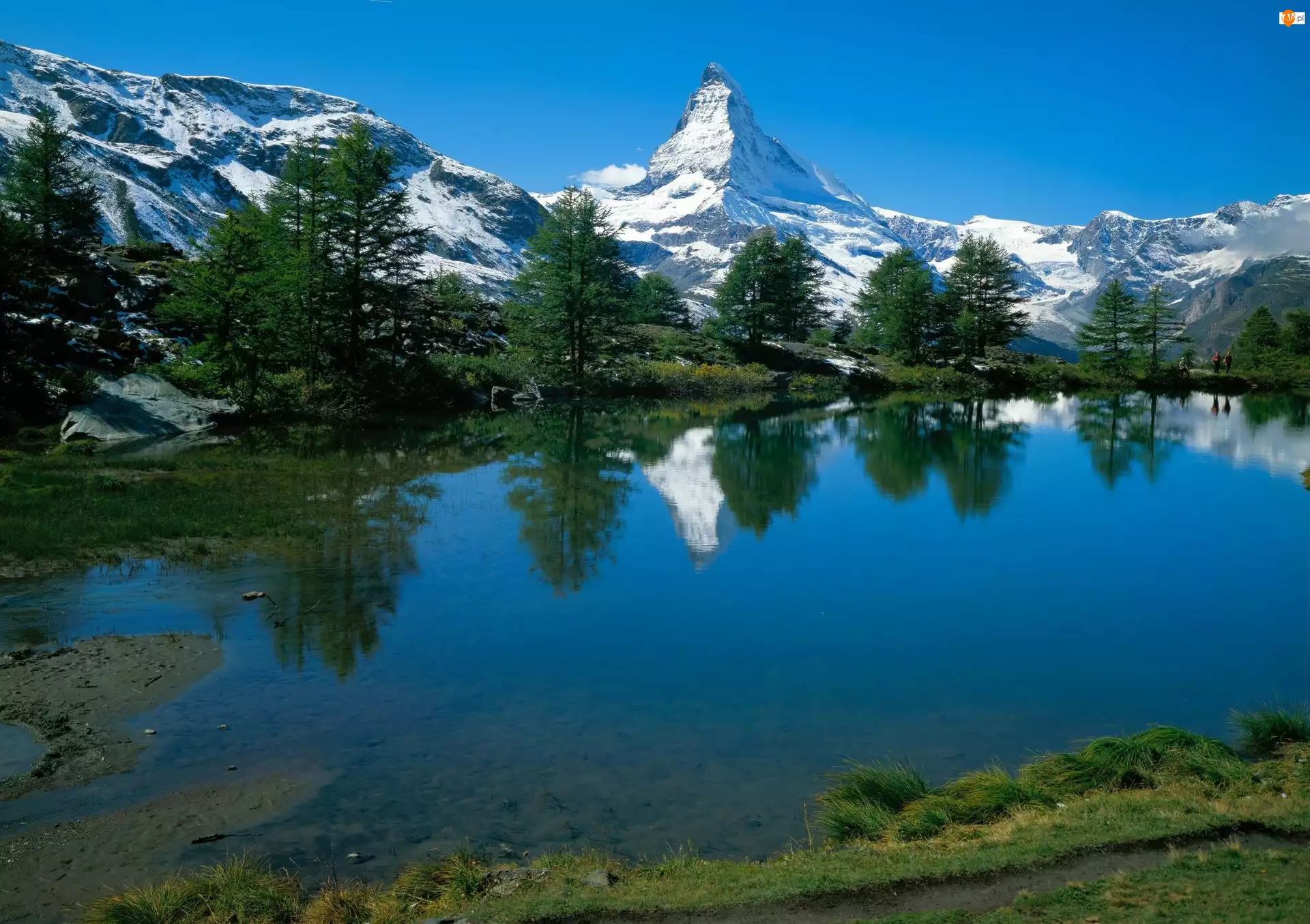 Szczyt Matterhorn, Drzewa, Alpy, Góry, Jezioro