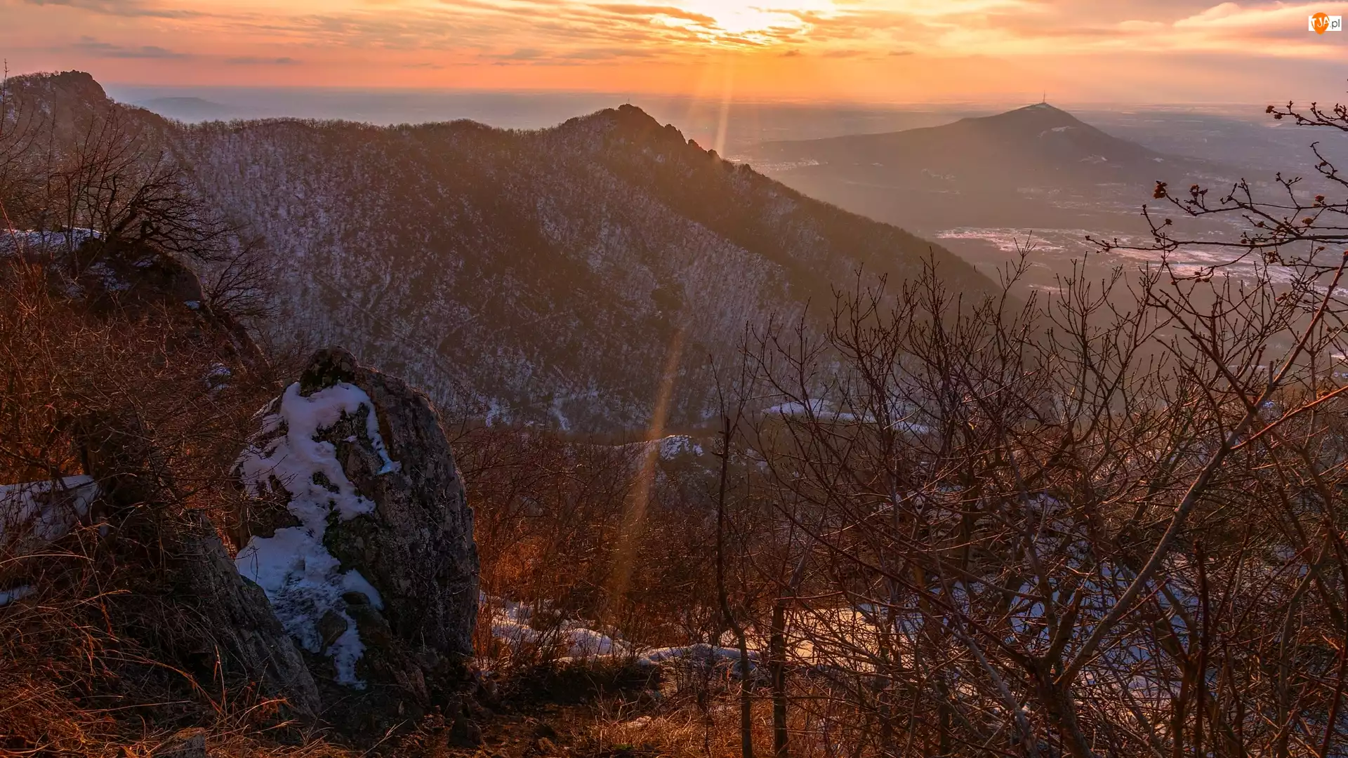 Drzewa, Góry, Wschód słońca, Skały