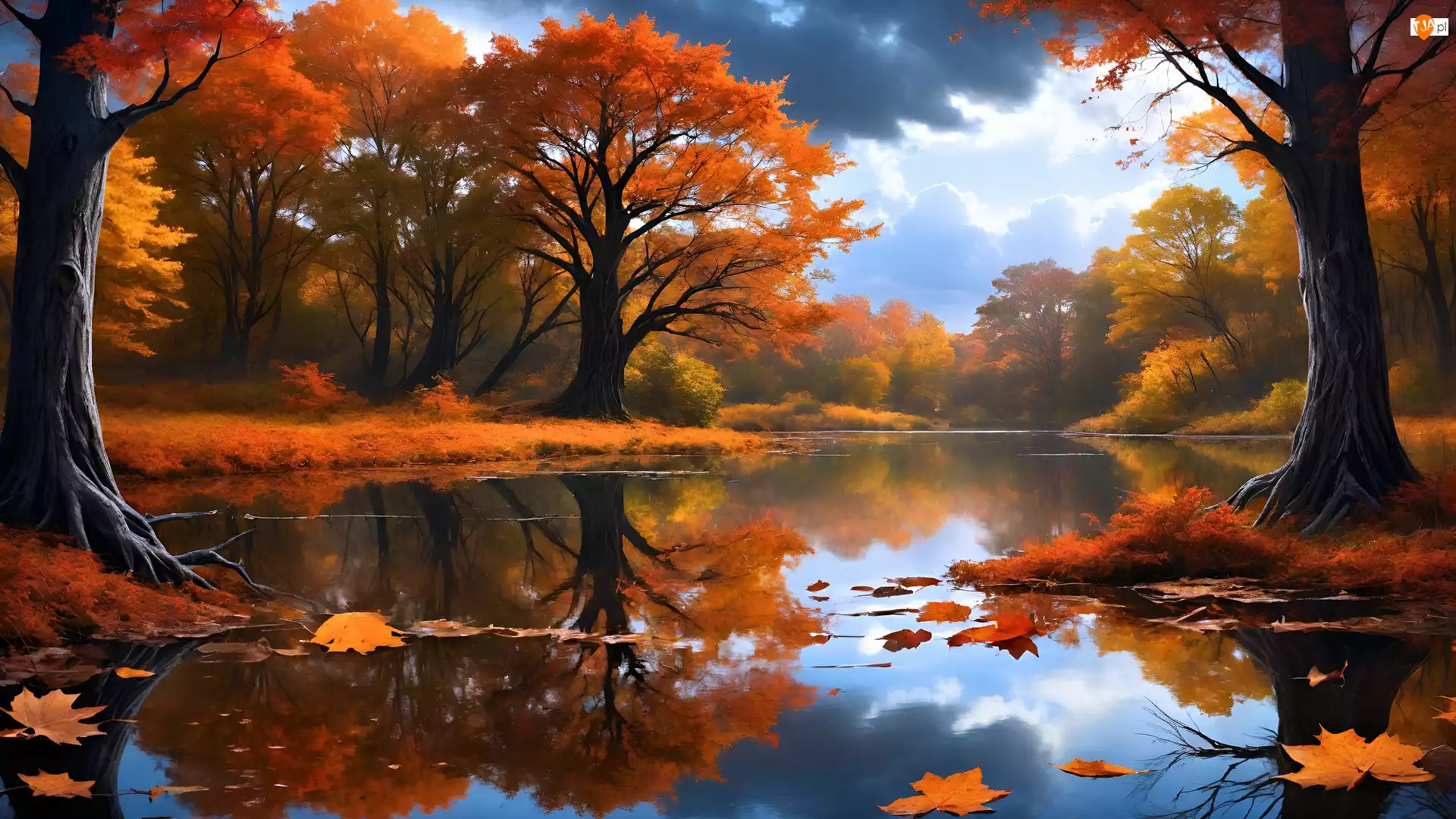 Drzewa, Grafika AI, Las, Staw, Jesień