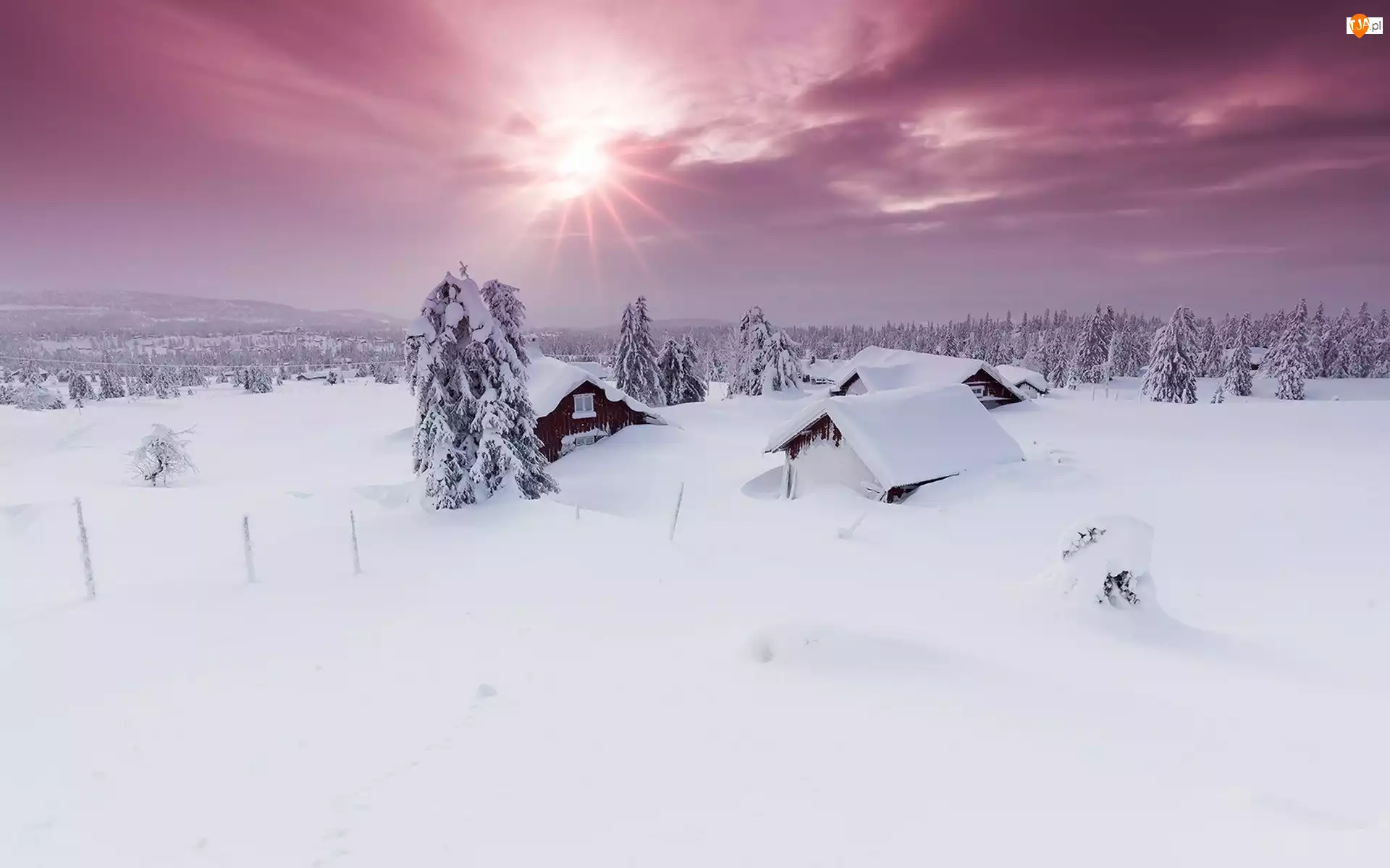 Domy, Zima, Promienie słońca, Drzewa, Zasypane