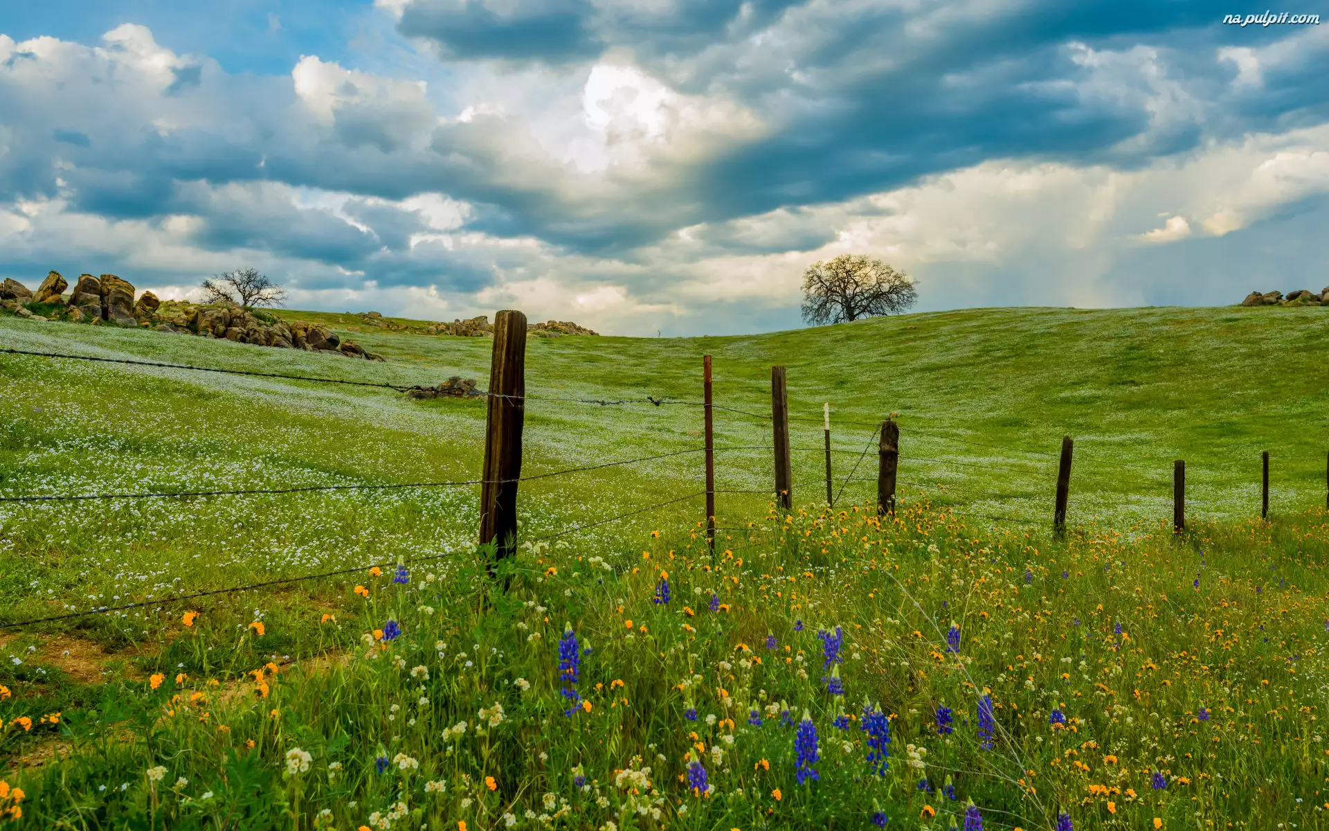 Chmury, Łąka, Drzewa, Ogrodzenie, Niebo, Kwiaty, Trawa, Pole, Kamienie