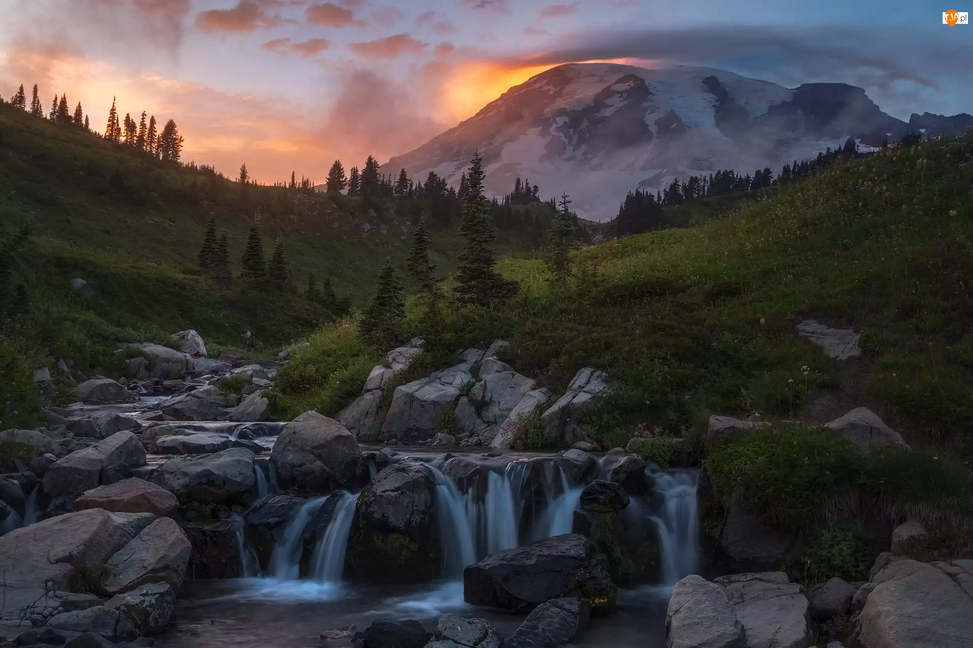 Kamienie, Góry, Potok, Niebo, Polana, Drzewa, Chmury, Rzeka