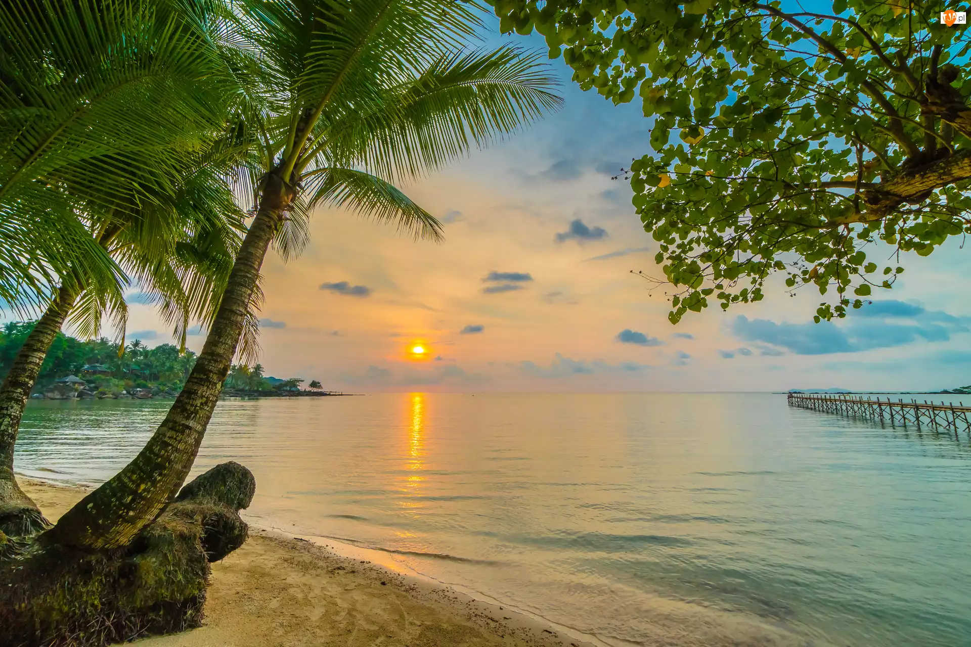 Palmy, Morze, Plaża, Zachód słońca, Drzewa, Molo