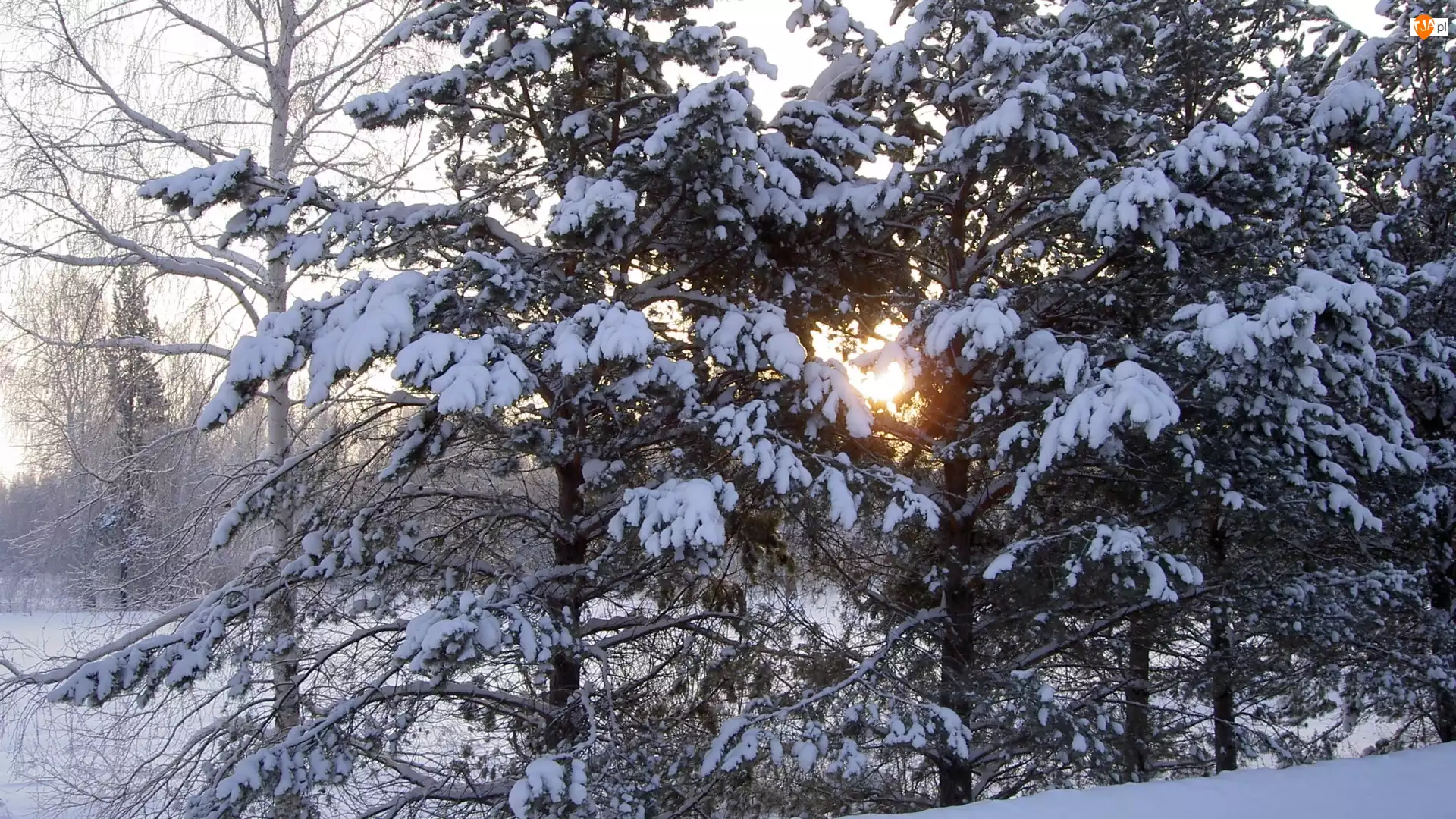Drzewa, Iglasty, Słońce, Zaspy, Śnieg, Las