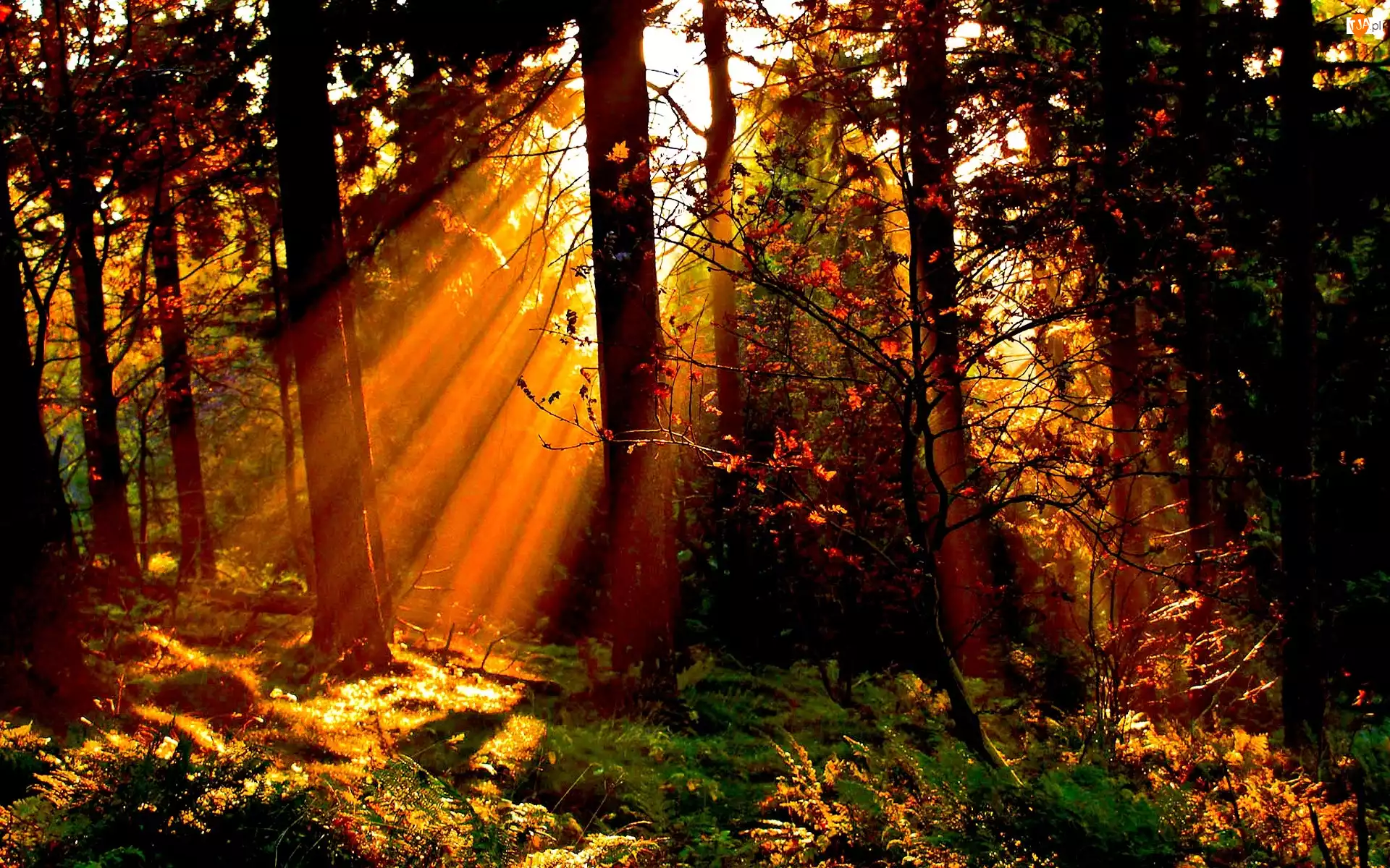Drzewa, Jesień, Las, Promienie Słońca
