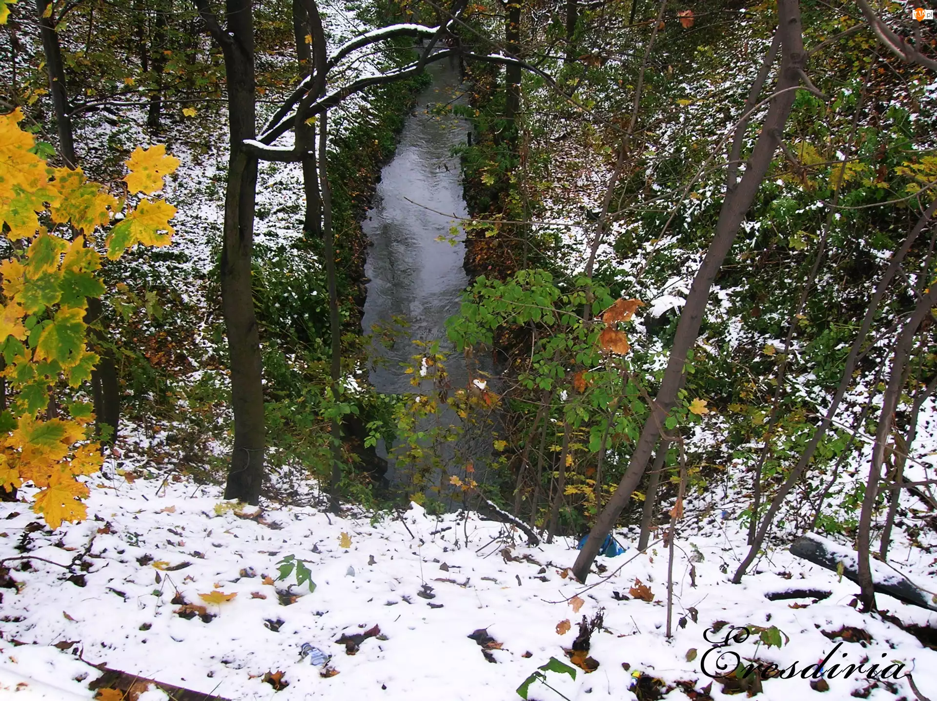 Drzewa, Jesień, Widok, Zima, Rzeka