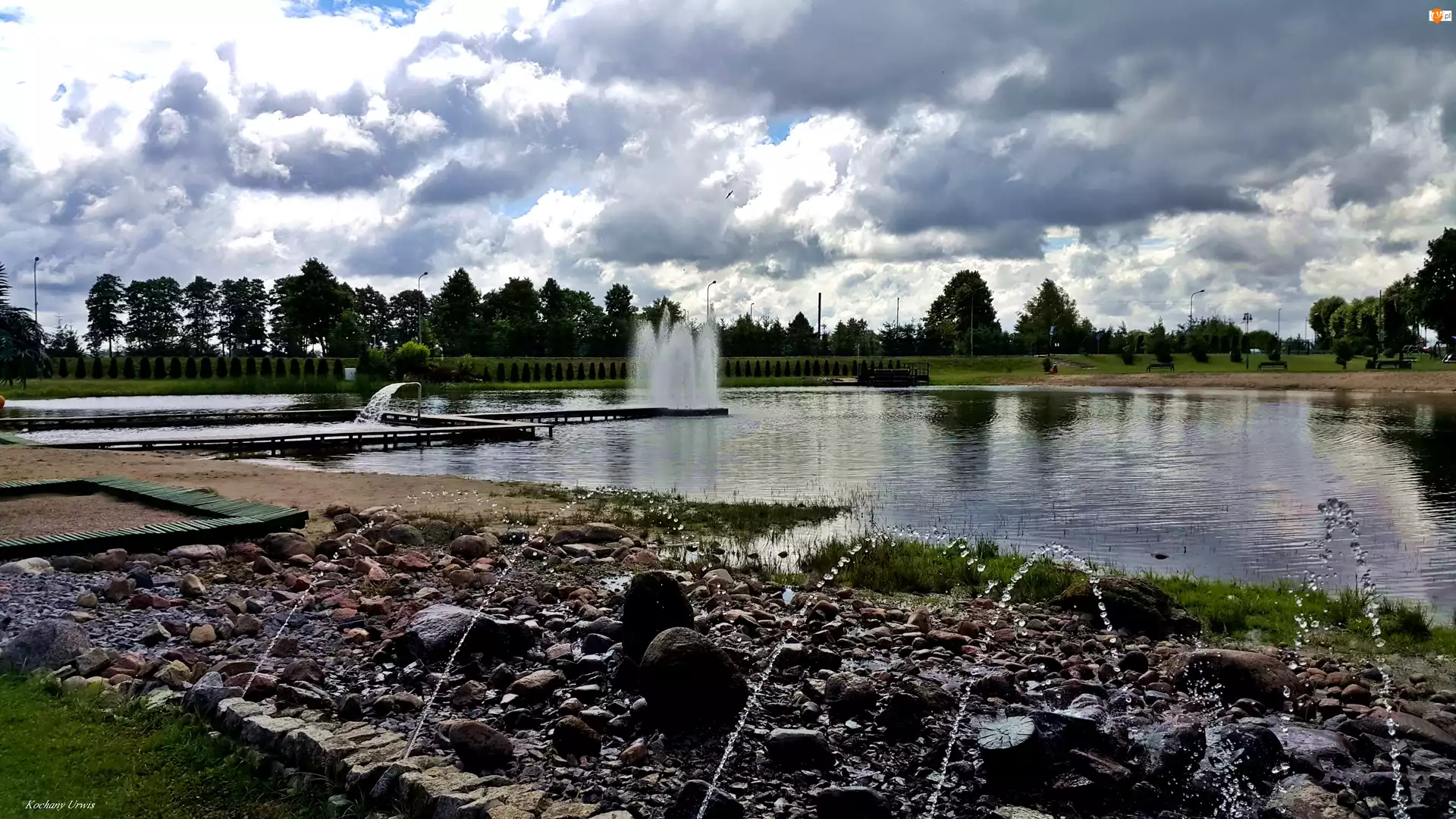 Chmury, Drzewa, Kamienie, Jeziorko, Fontanna