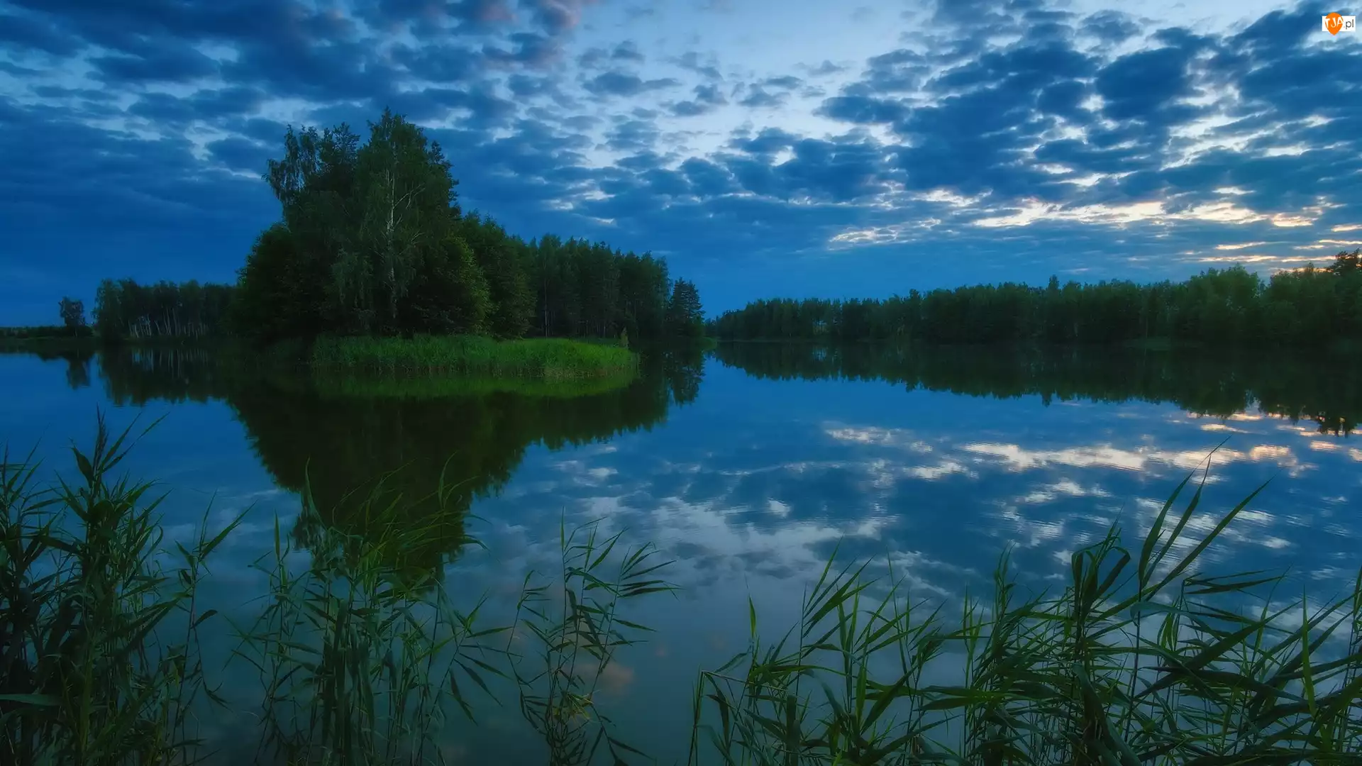 Drzewa, Jezioro, Trzciny, Odbicie, Las, Niebo