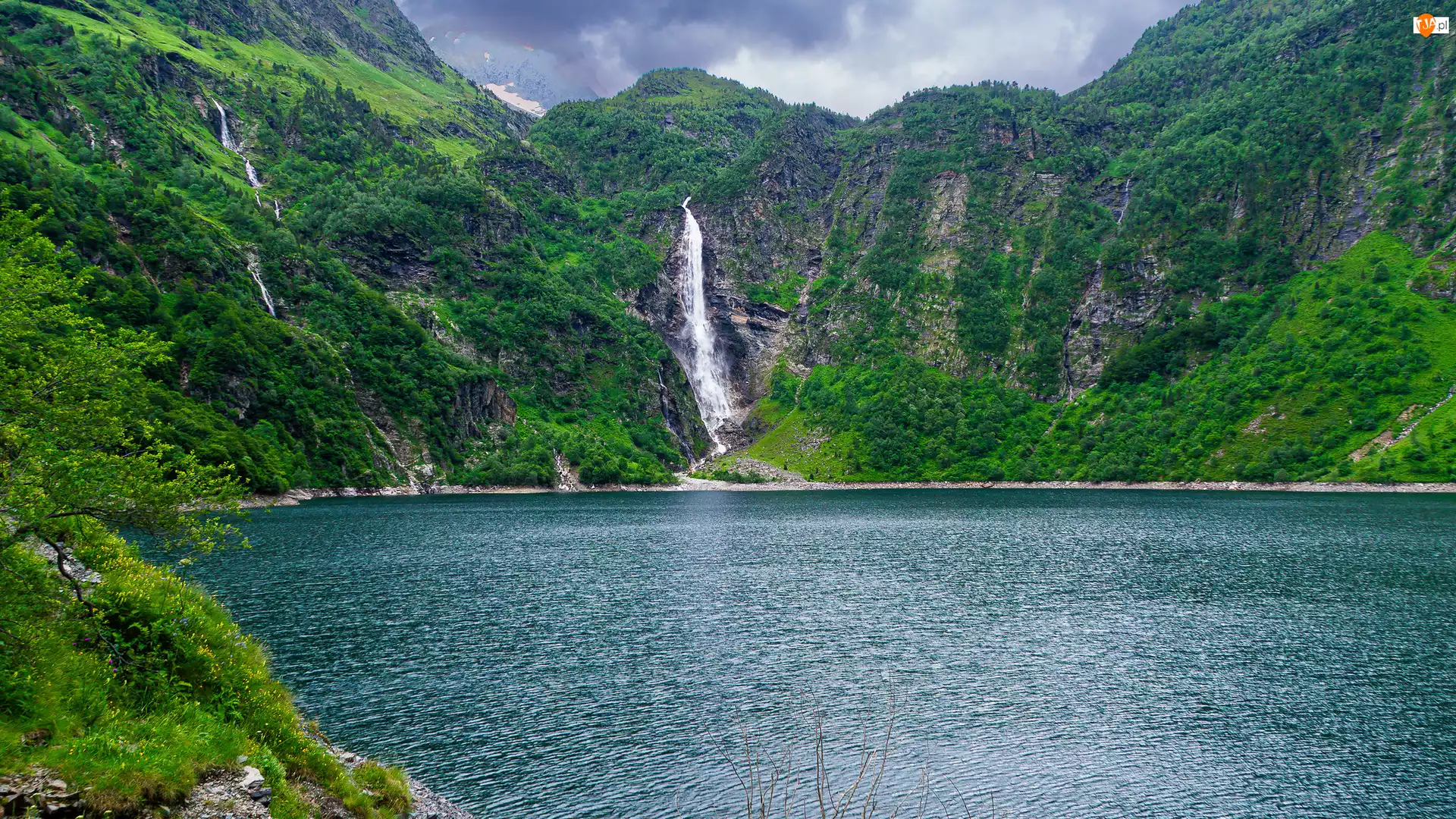 Drzewa, Jezioro, Wodospad, Góry