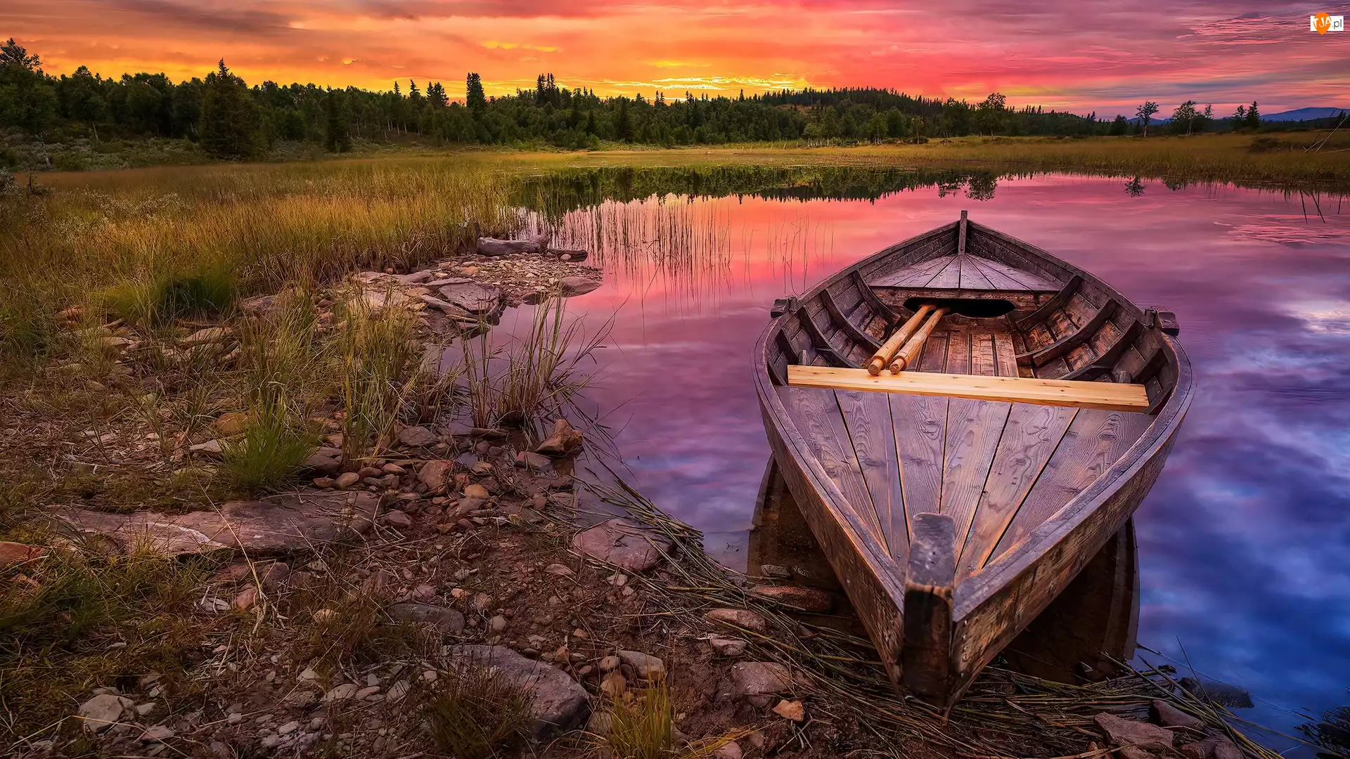 Drzewa, Jezioro, Zachód Słońca, Łódka