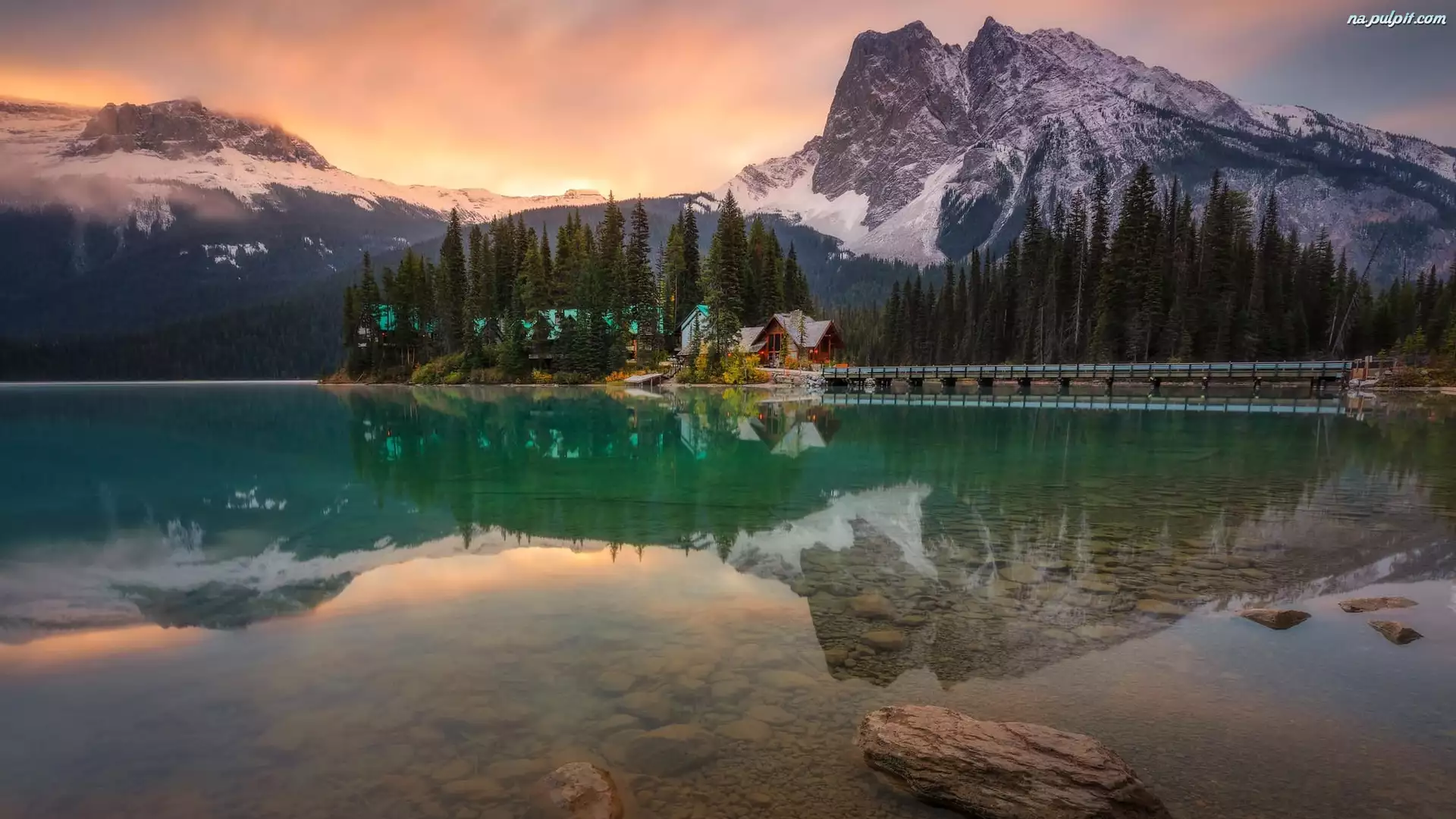 Drzewa, Kanada, Jezioro, Góry, Alberta, Emerald Lake, Dom, Park Narodowy Yoho