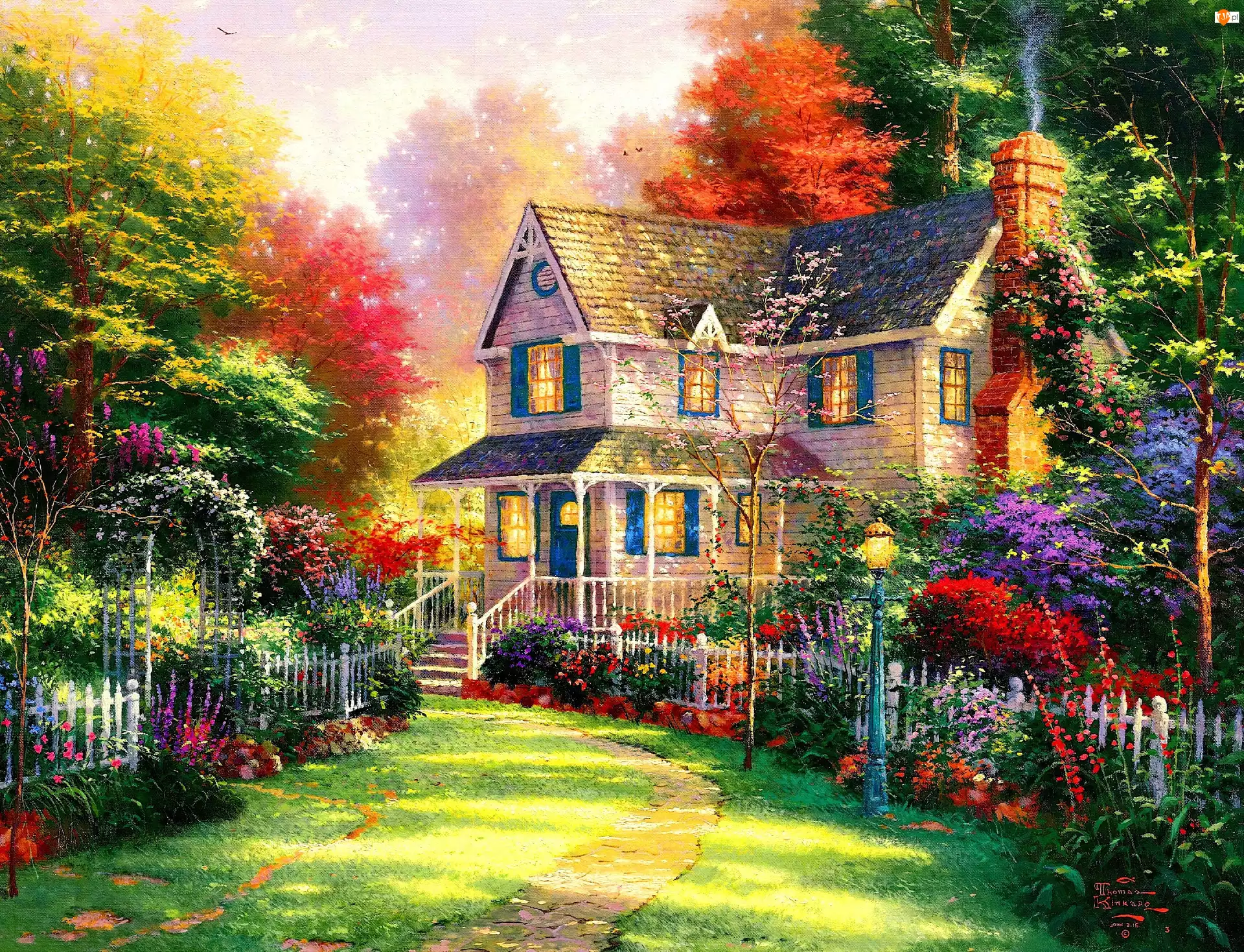 Drzewa, Kwiaty, Dom, Obraz, Kolorowe, Krzewy