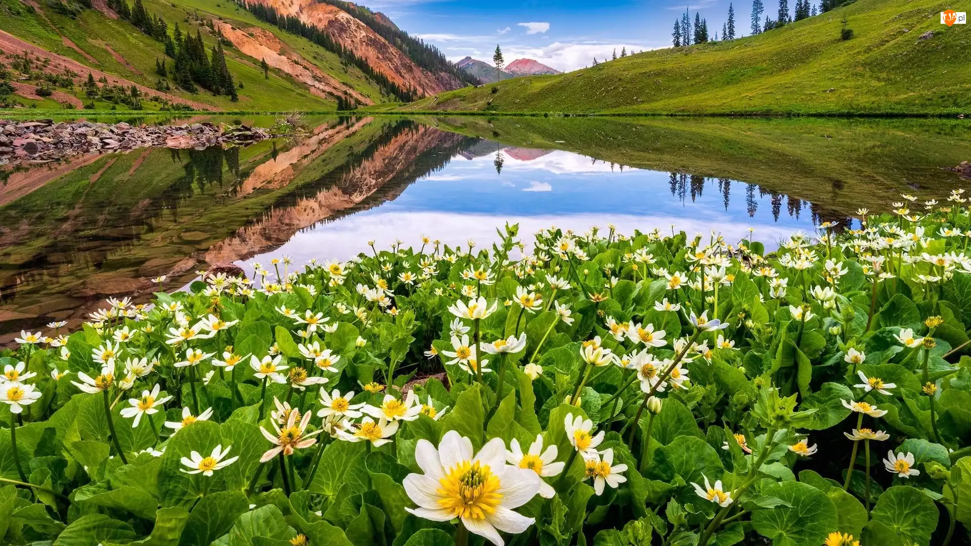 Drzewa, Kwiaty, Jezioro, Góry, Białe