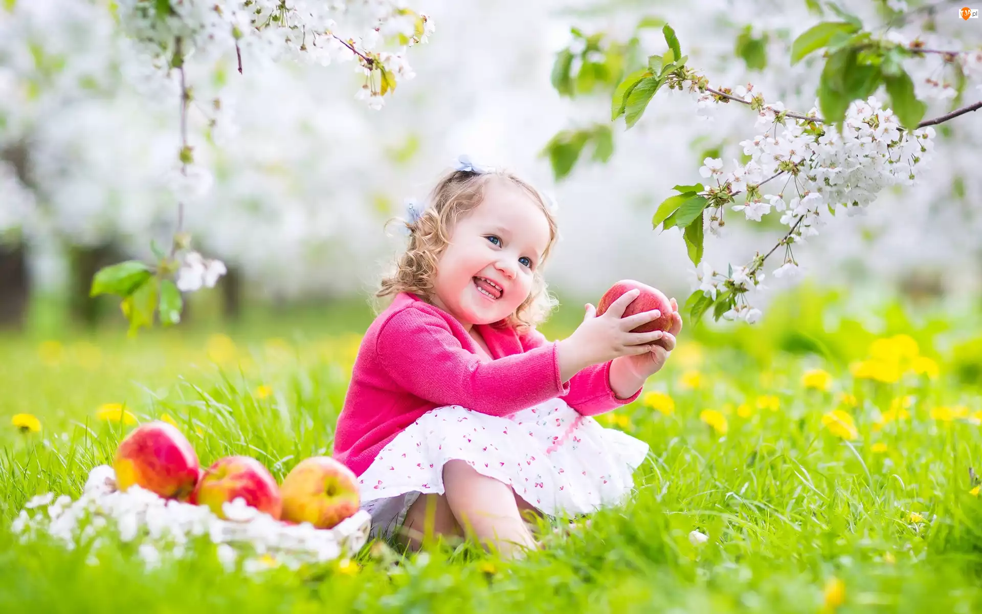 Drzewa, Łąka, Dziewczynka, Radosna, Wiosna, Jabłka, Kwitnące