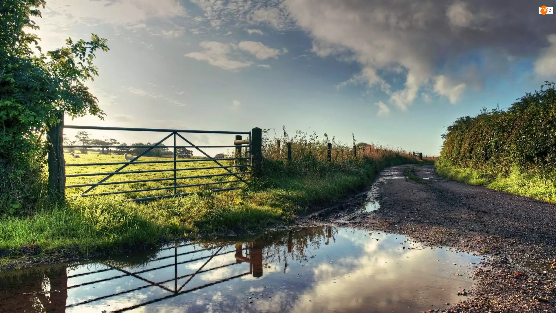 Drzewa, Łąka, Krowa, Ogrodzenie , Droga