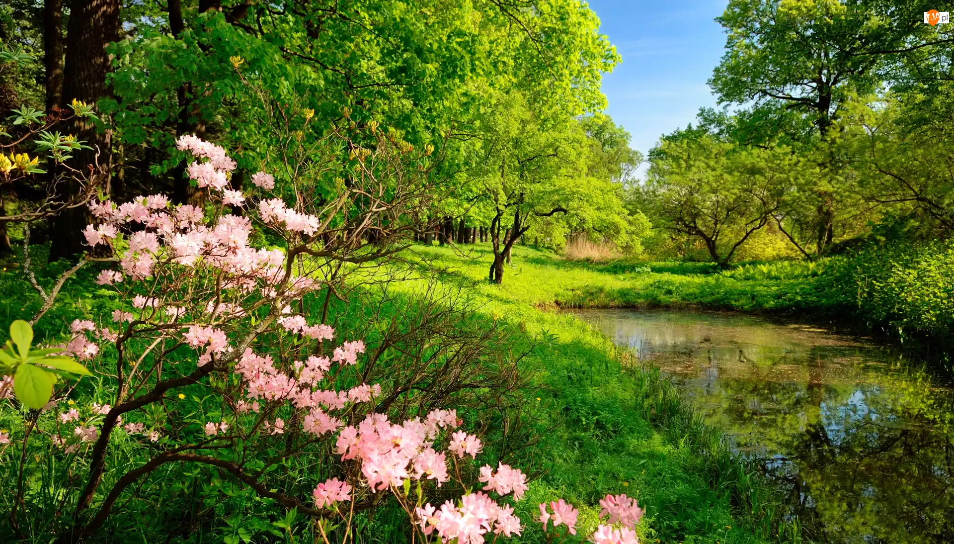 Drzewa, Łąka, Krzew, Kwitnący, Staw