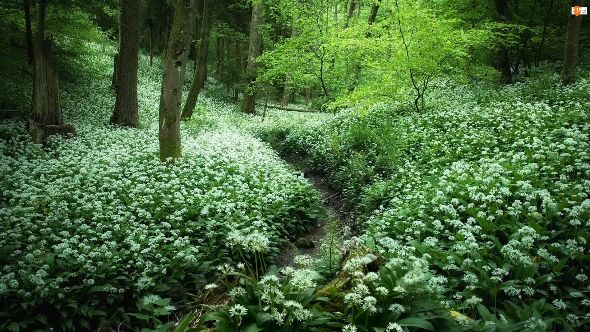 Drzewa, Las, Czosnek niedźwiedzi, Wiosna, Kwiaty,