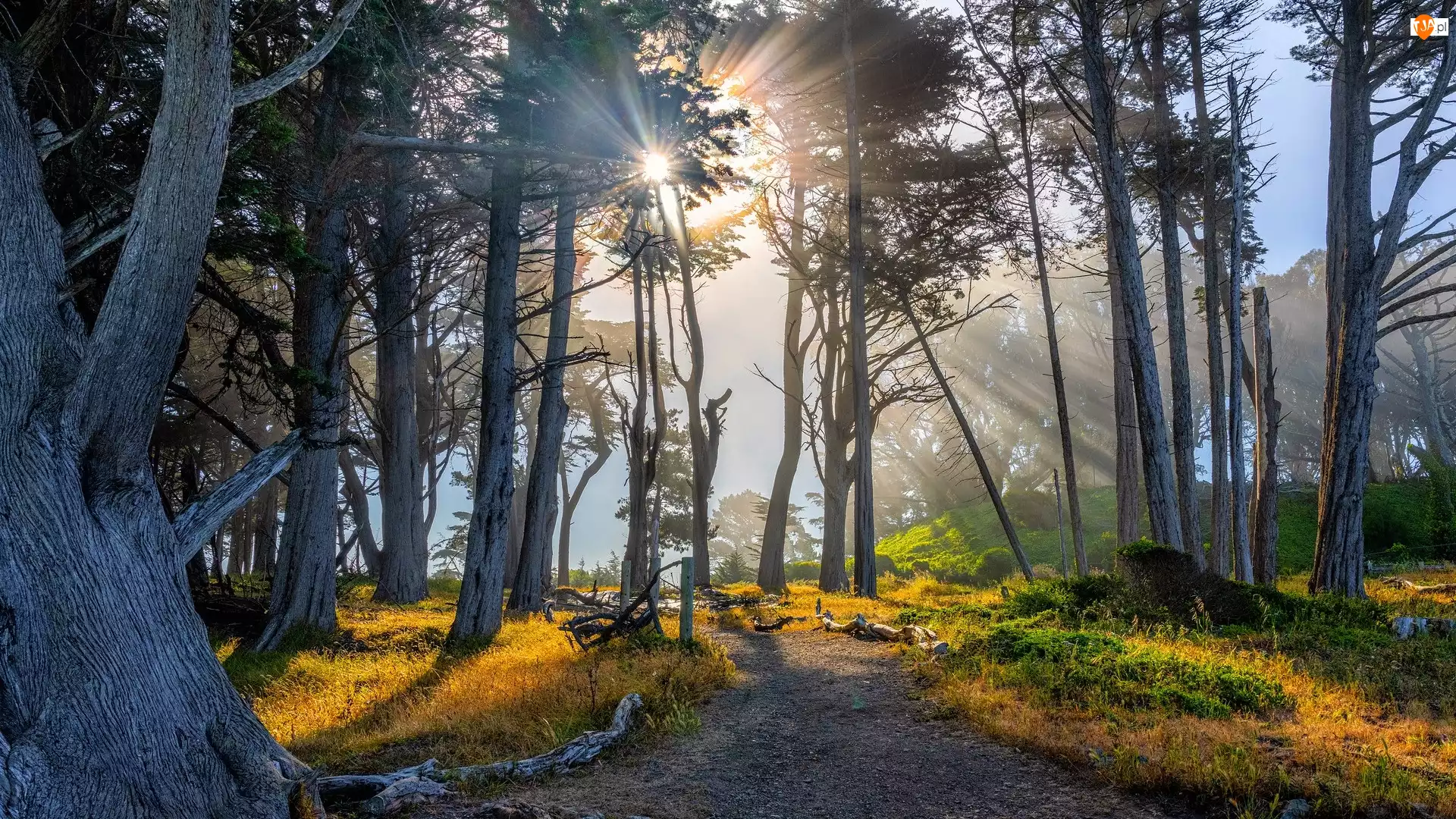 Drzewa, Las, Droga, Trawa, Przebijające światło