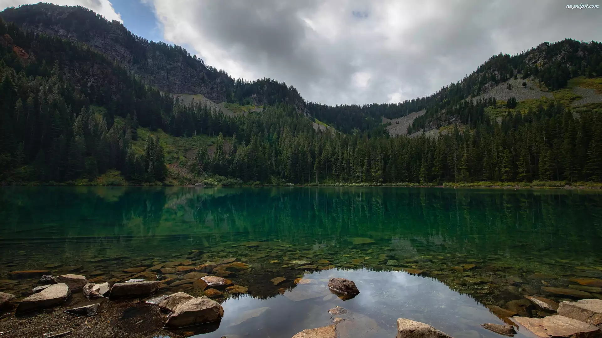 Drzewa, Las, Jezioro, Chmury, Góry, Kamienie