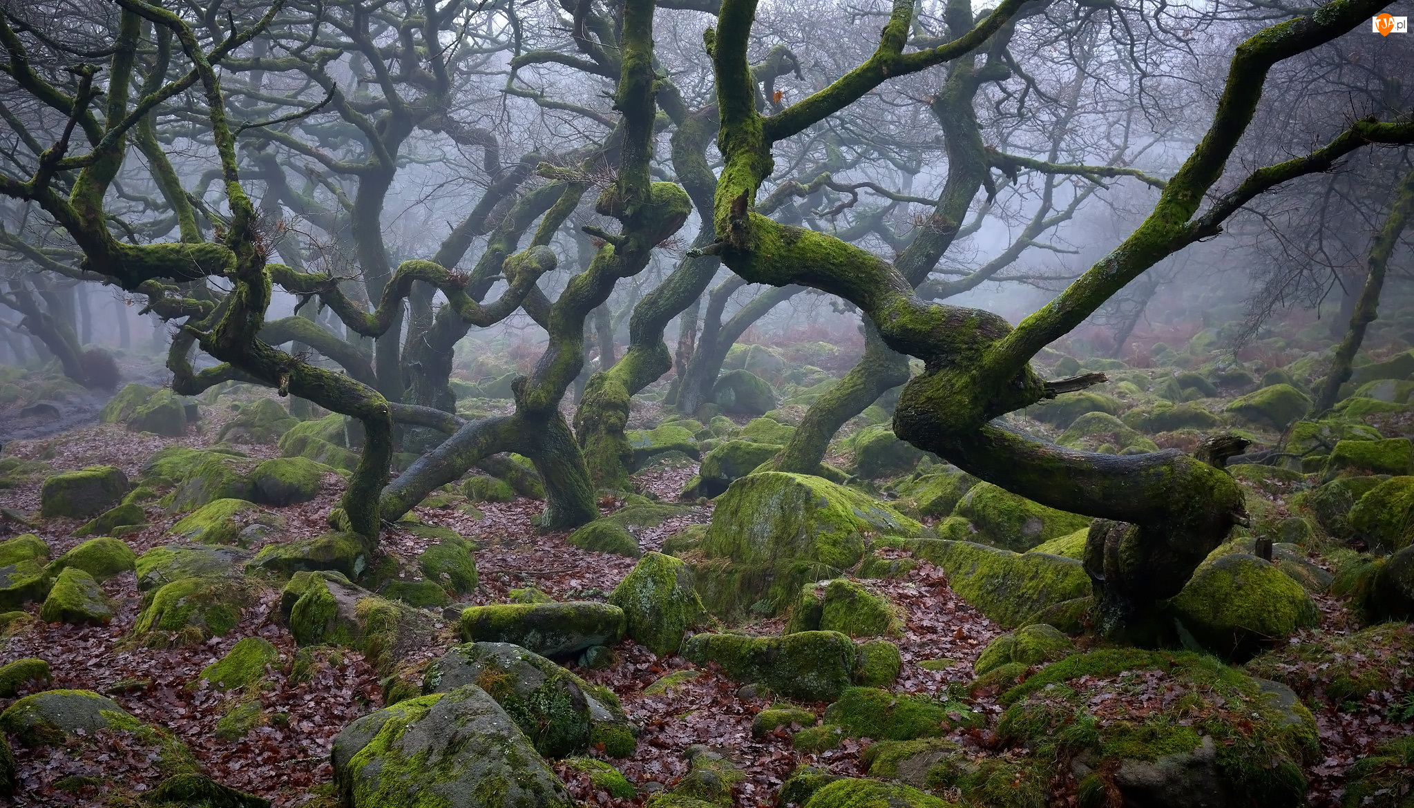 Drzewa, Las, Kamienie, Mgła, Omszone, Liście