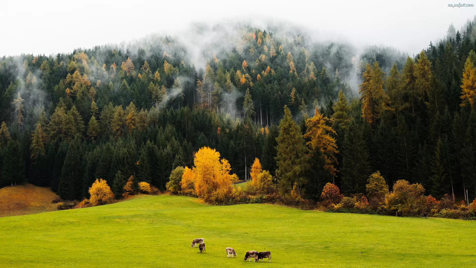Drzewa, Las, Łąka, Jesień, Mgła, Krowy