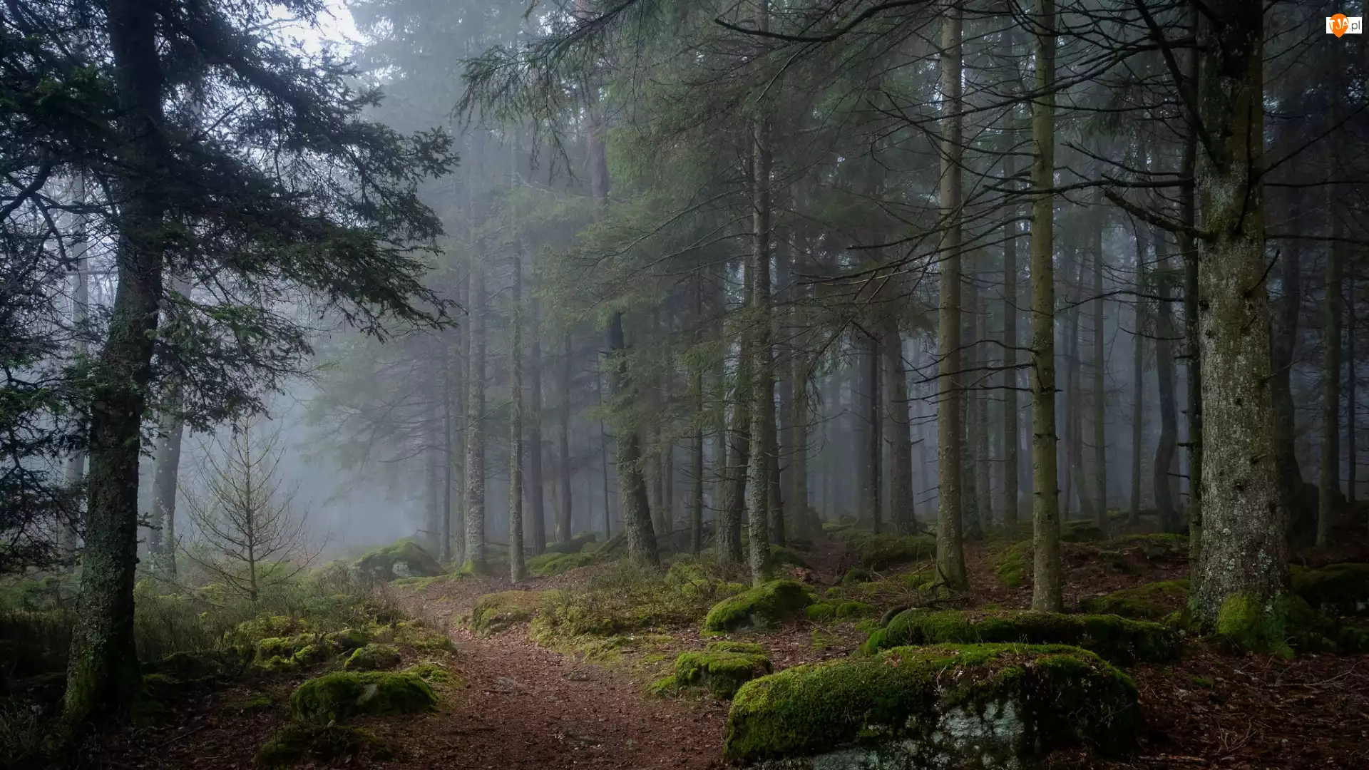Drzewa, Las, Mgła, Kamienie, Ścieżka, Omszałe