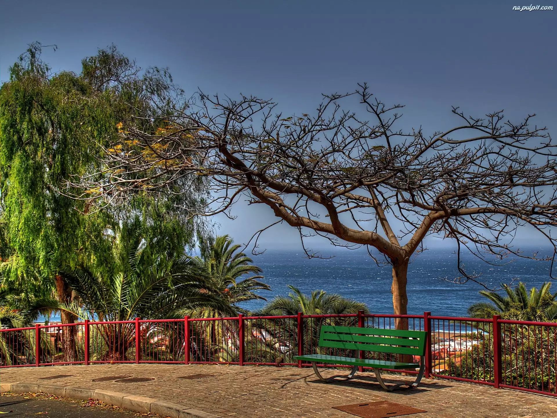 Drzewa, Ławka, Morze, Ogrodzenie