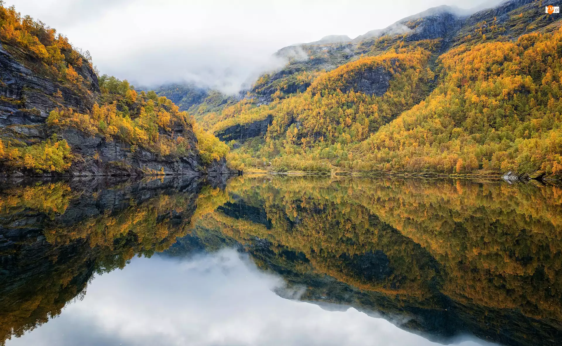 Drzewa, Mgła, Góry, Jesień, Jezioro