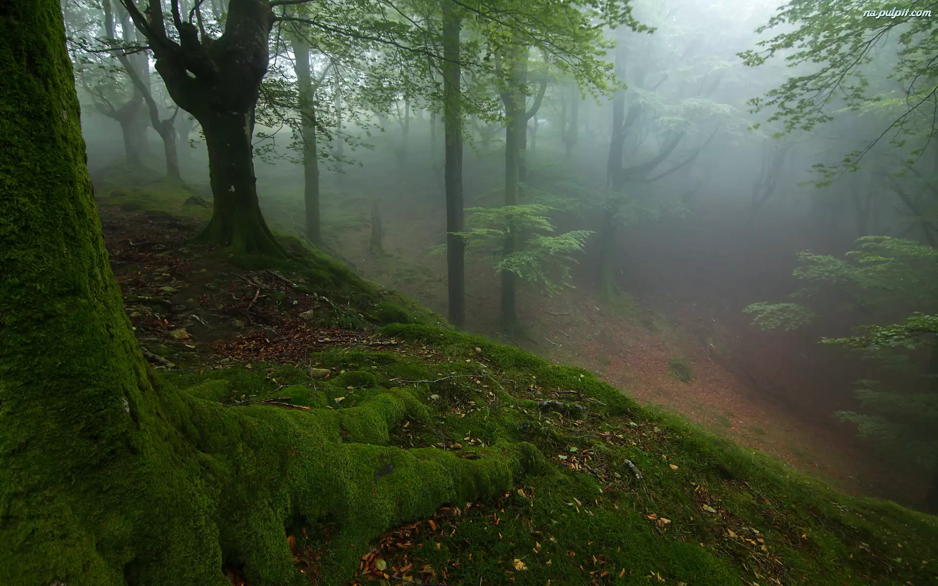 Drzewa, Mgła, Omszałe, Las, Korzenie