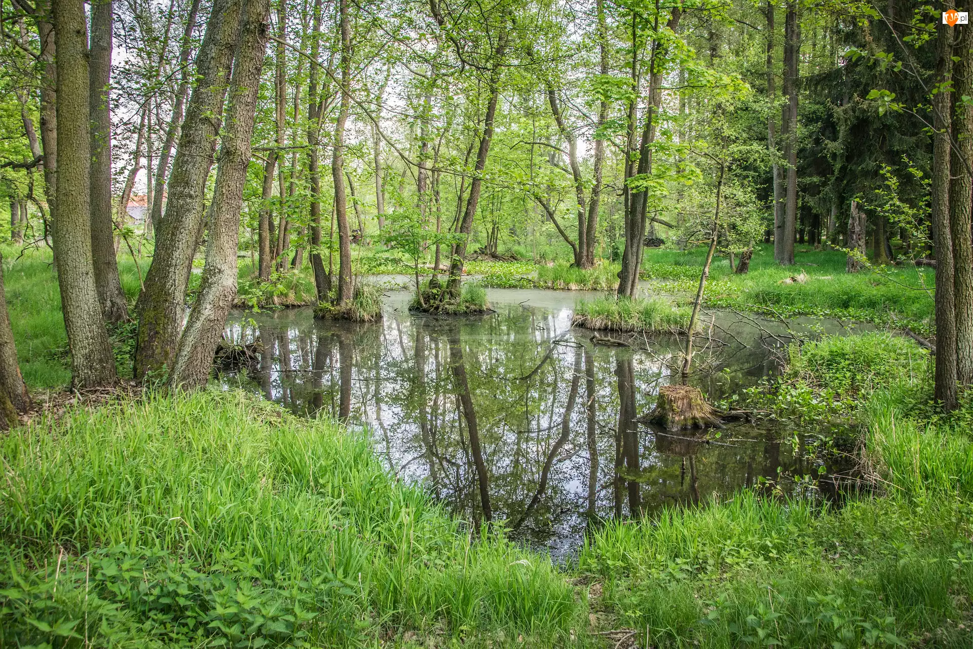Bagna, Wiosna, Drzewa, Trawa
