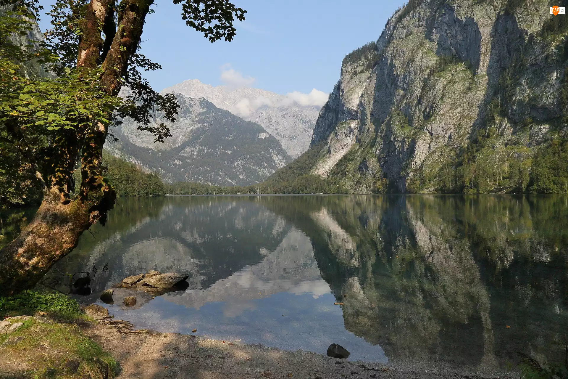 Jezioro Obersee, Niemcy, Góry, Drzewo, Park Narodowy Berchtesgaden