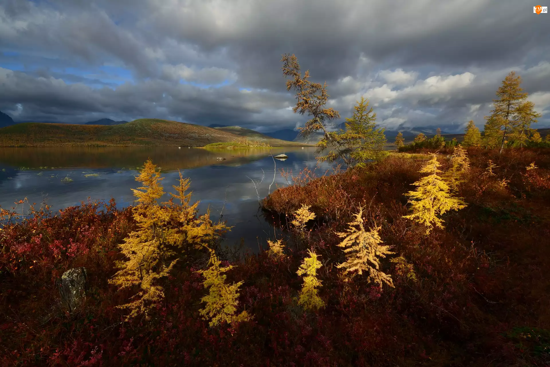 Drzewa, Jezioro Jack London, Rosja, Jesień, Obwód magadański, Kołyma, Góry