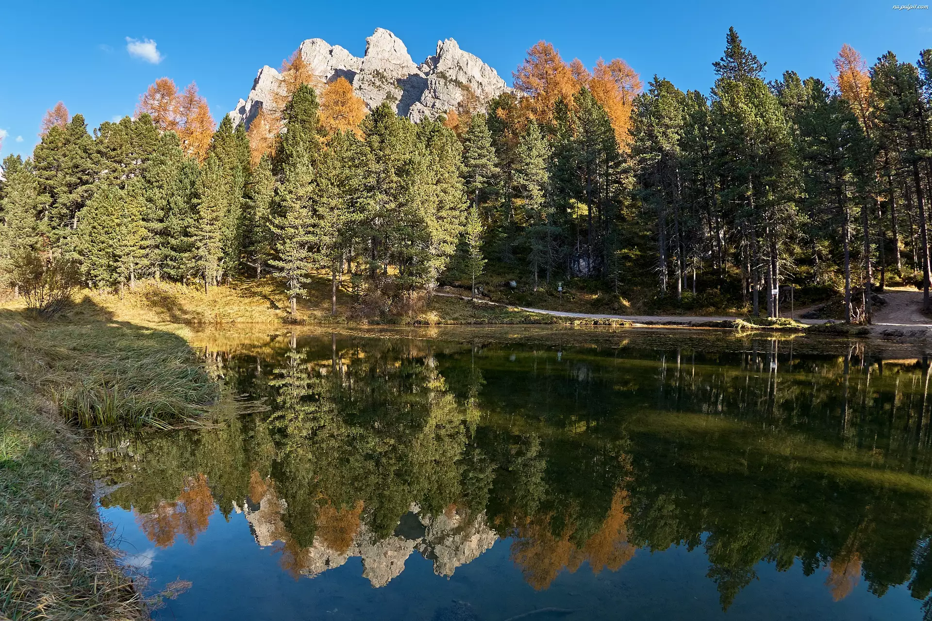 Drzewa, Niebo, Las, Chmurka, Jezioro, Góry