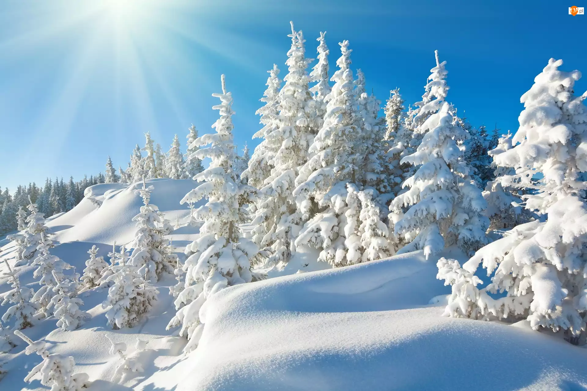 Drzewa, Niebo, Ośnieżone, Zima, Promienie słońca