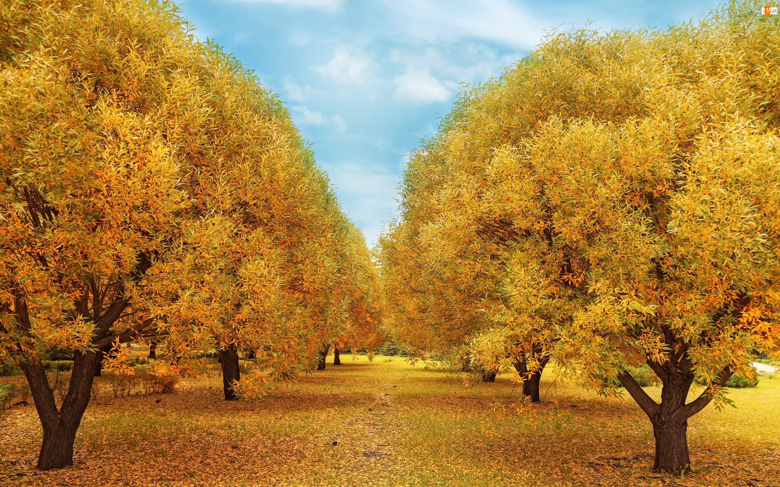 Drzewa, Niebo, Pożółkłe, Jesień, Liście