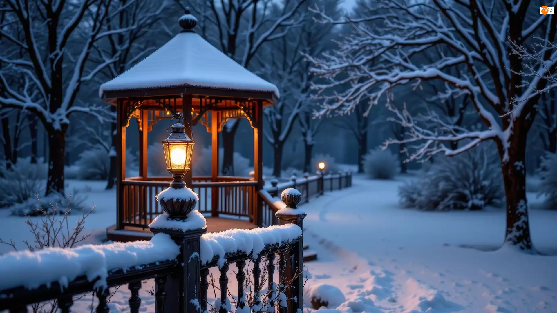 Drzewa, Noc, Ośnieżone, Ogrodzenie, Lampion, Park, Altana, Zima, Śnieg