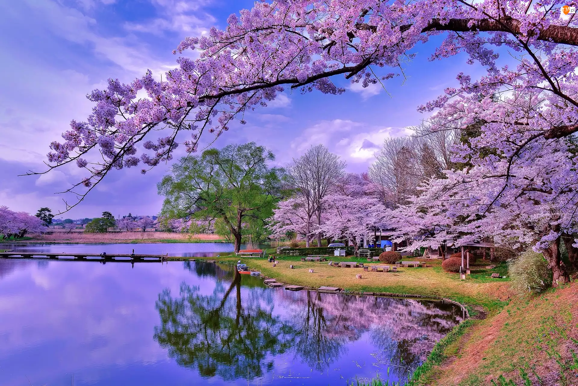 Drzewa, Odbicie, Park, Wiosna, Rzeka, Wiśni